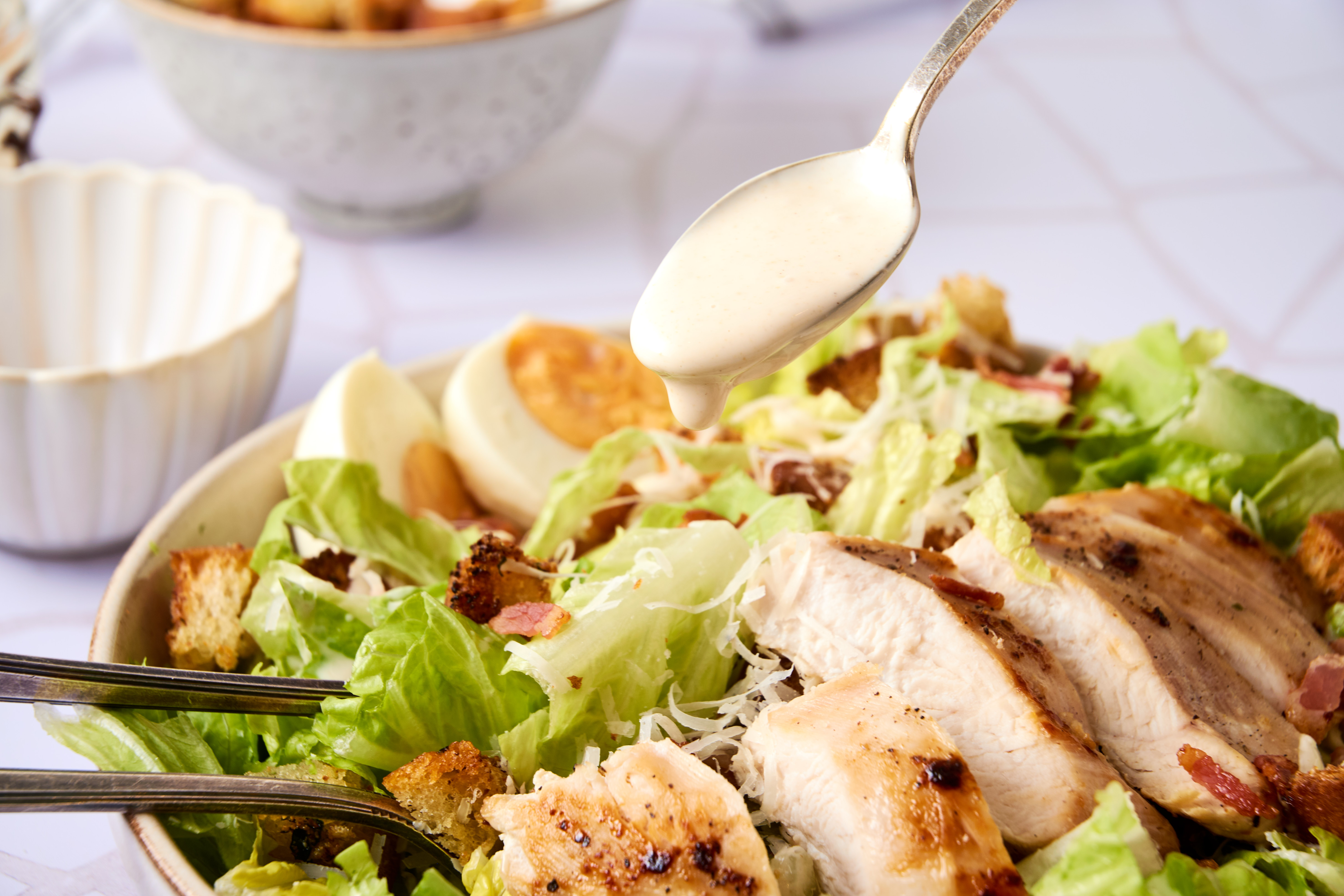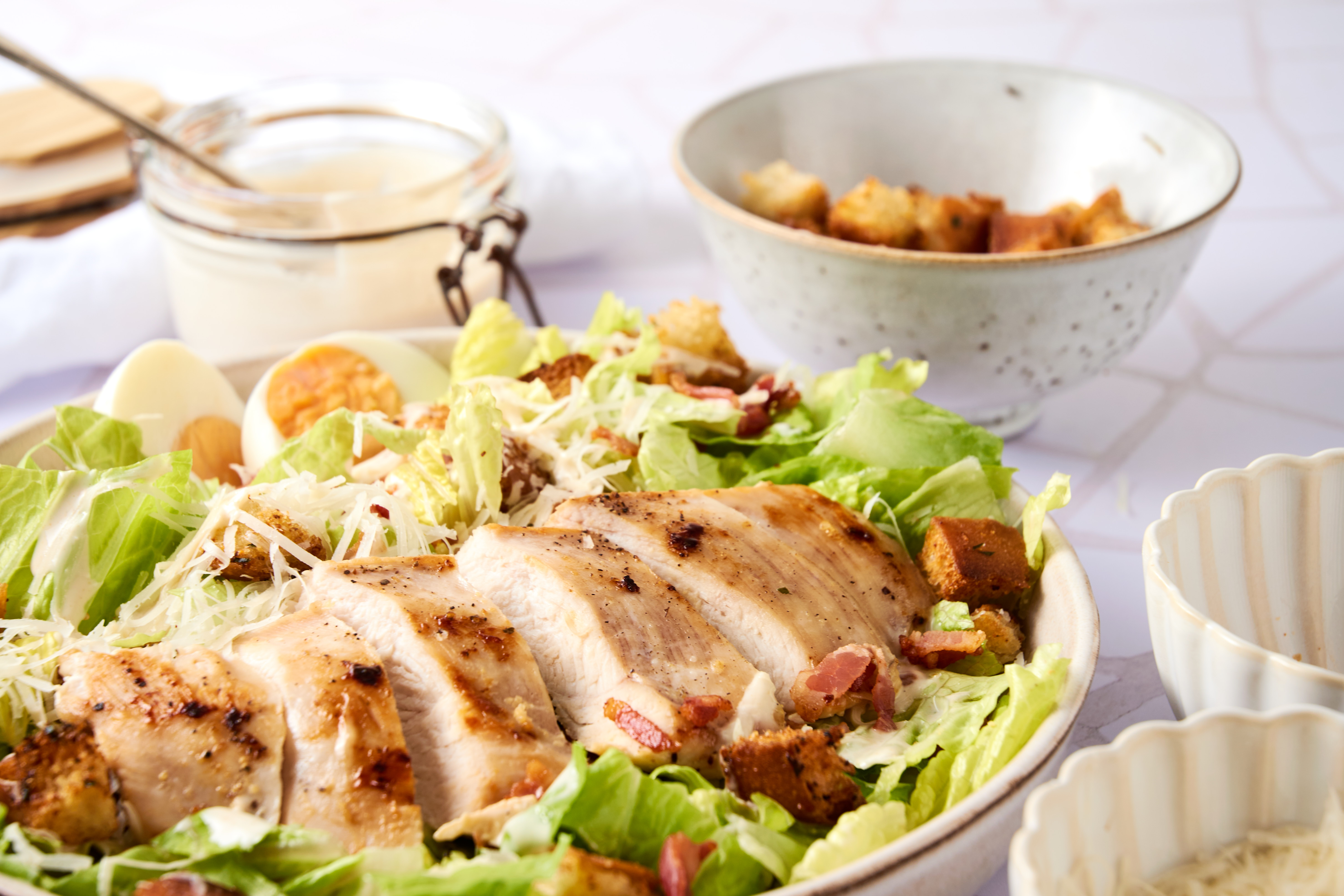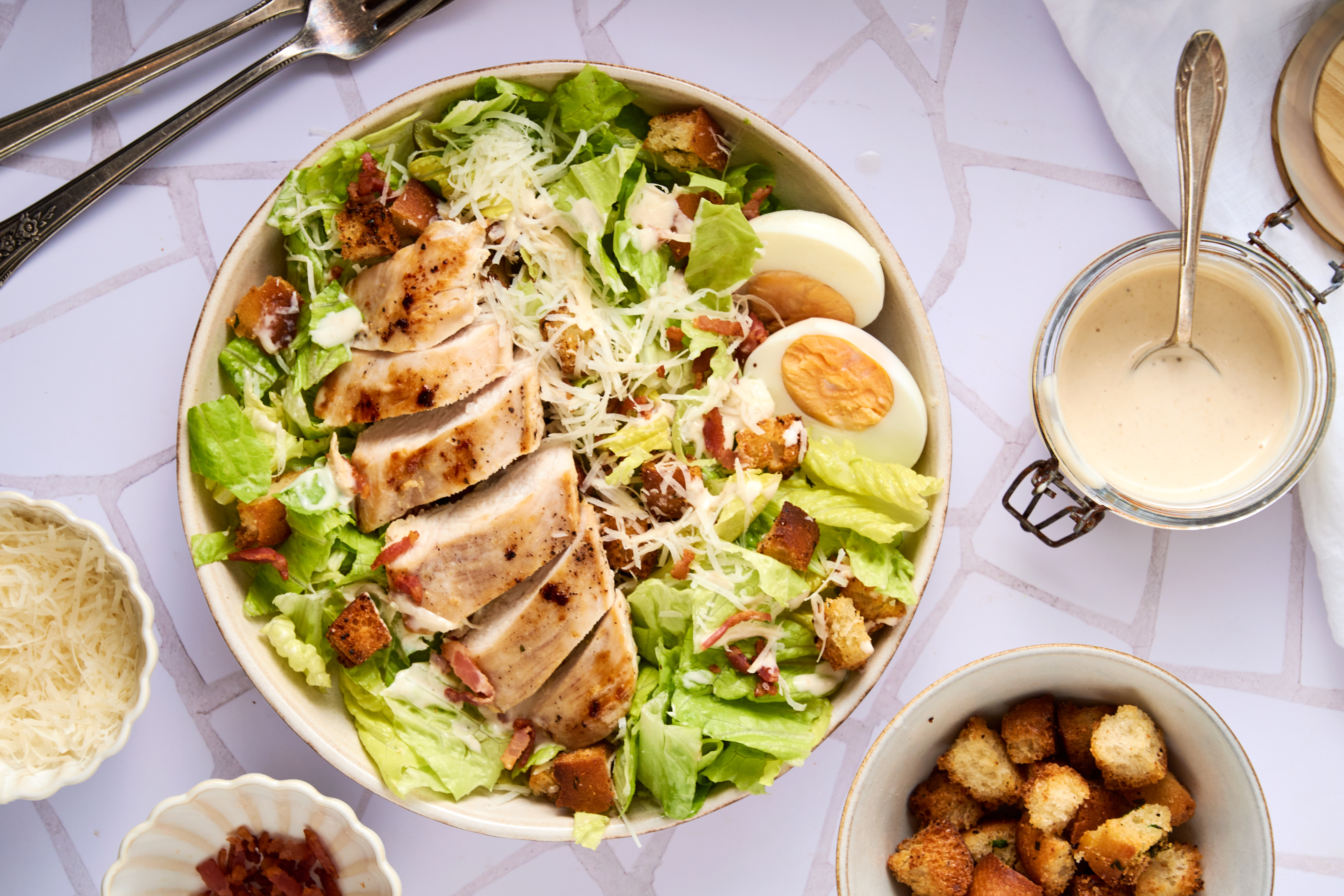 This salad might be more than something special! It's a salad or a full-fledged meal because Anything-Goes Caesar Salad pulls out all the stops! Creamy, tangy, and flavorful Caesar dressing, garlic croutons, and succulent bacon crumbles all come together to make this Caesar salad extra filling and extra fantastic. And when you add some pan-seared chicken and hard-boiled eggs? Well, Anything-Goes Caesar Salad makes sure you'll be going the extra mile for the rest of the day!