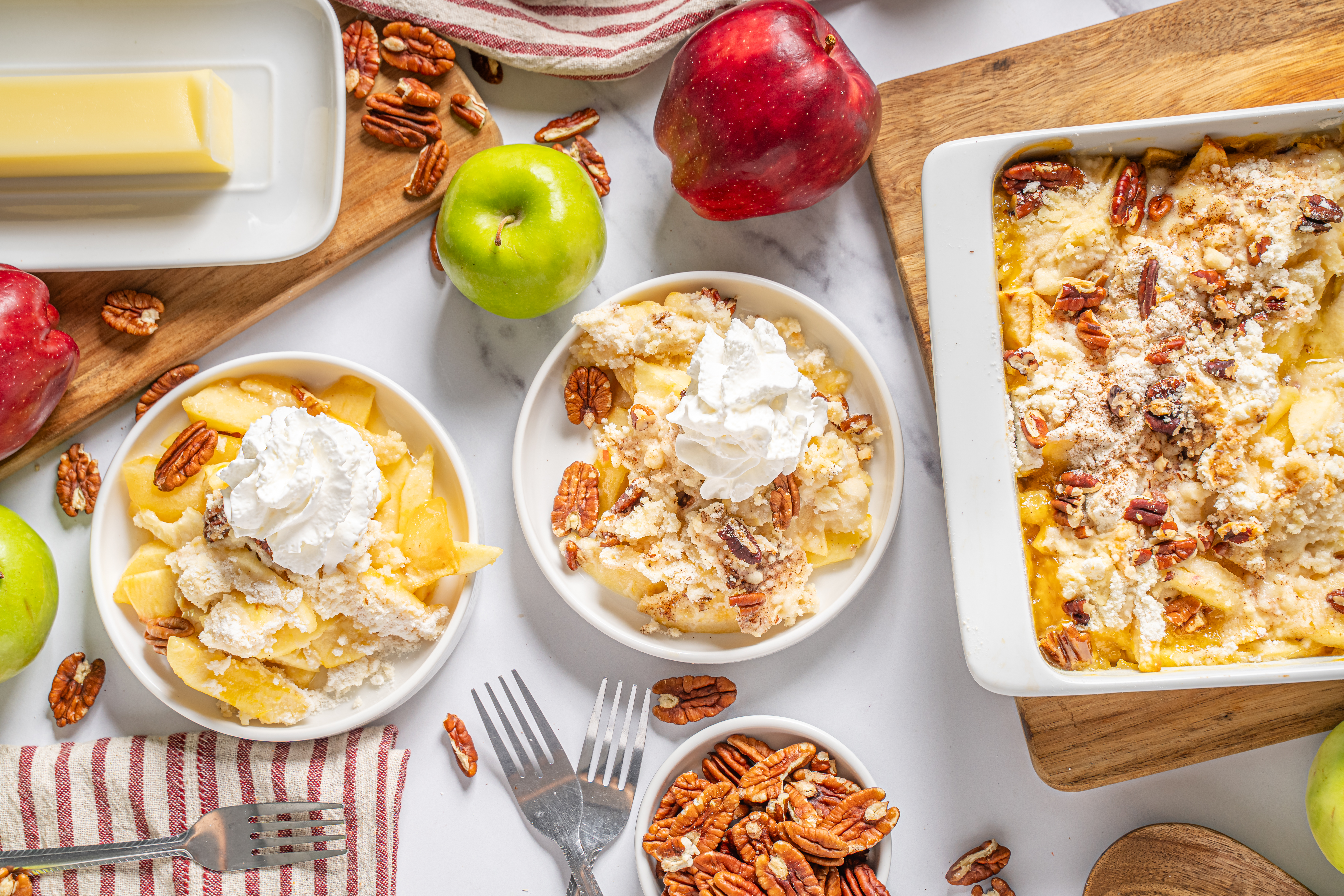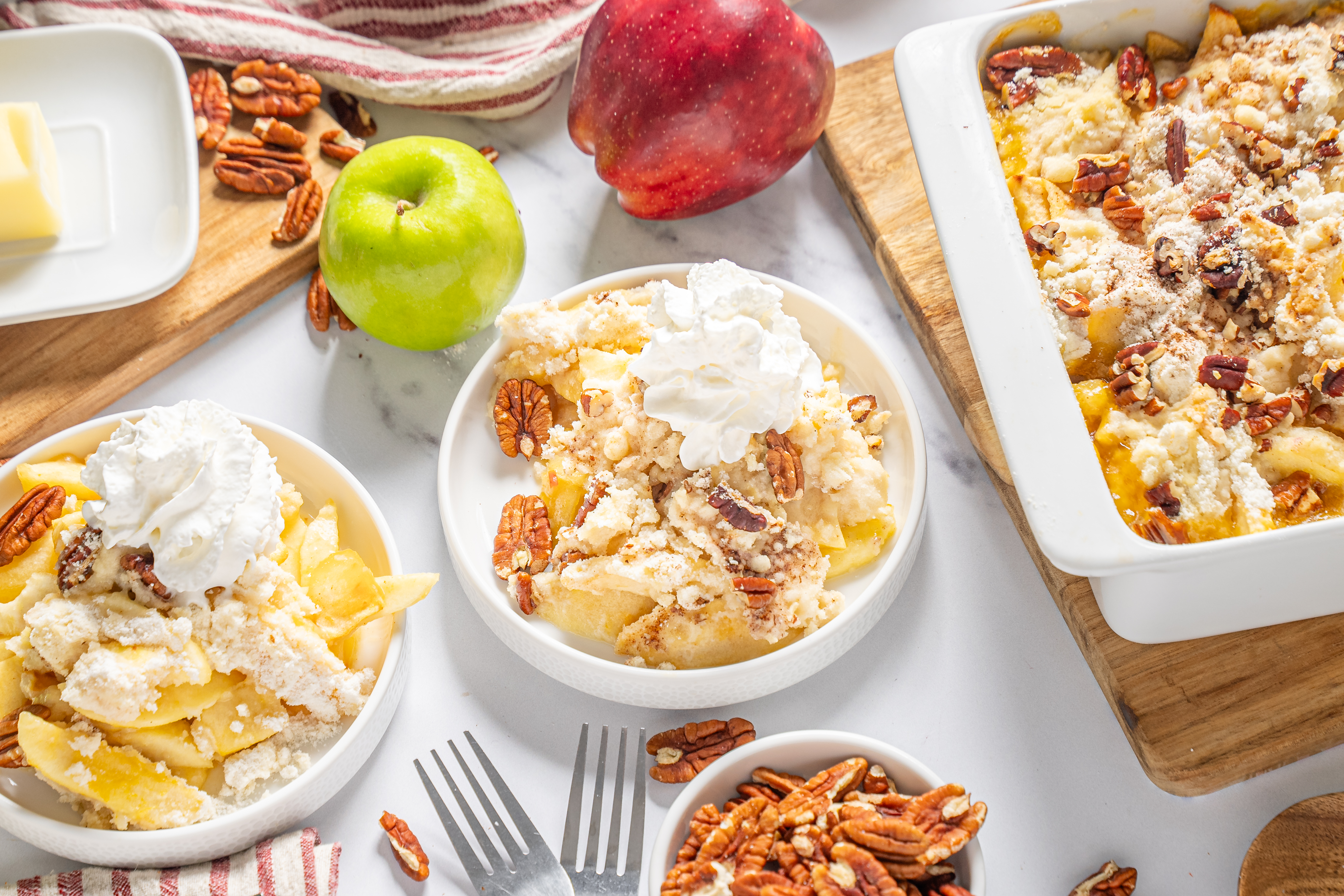 You probably don't expect your dump cake to have a bounty of autumnal deliciousness bubbling just under the surface! That's why this is the Apple Surprise Dump Cake! The filling is jammy, tender, and beautifully fall-inspired, with the tart apples enhanced by sharp citrus and smoky brown sugar. On top is a buttery, crumbly snickerdoodle crust with plenty of cinnamon-sugar (is it just us or does cookie dough make the best kind of crust?). You'll be surprised by how much you love the Apple Surprise Dump Cake... or perhaps it won't surprise you at all!