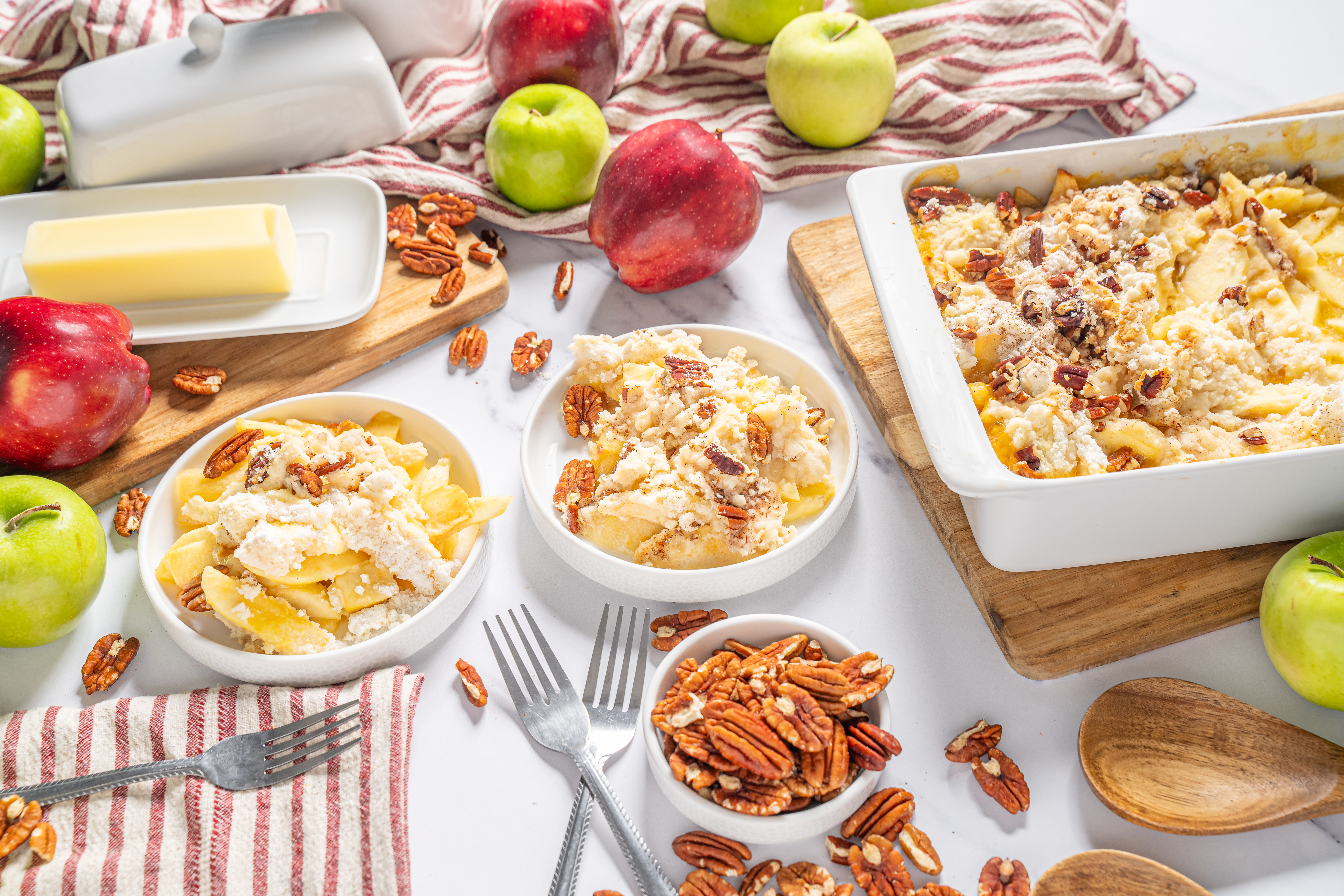 Step 6 -Sprinkle the cookie mixture over the apple mixture in the baking dish.