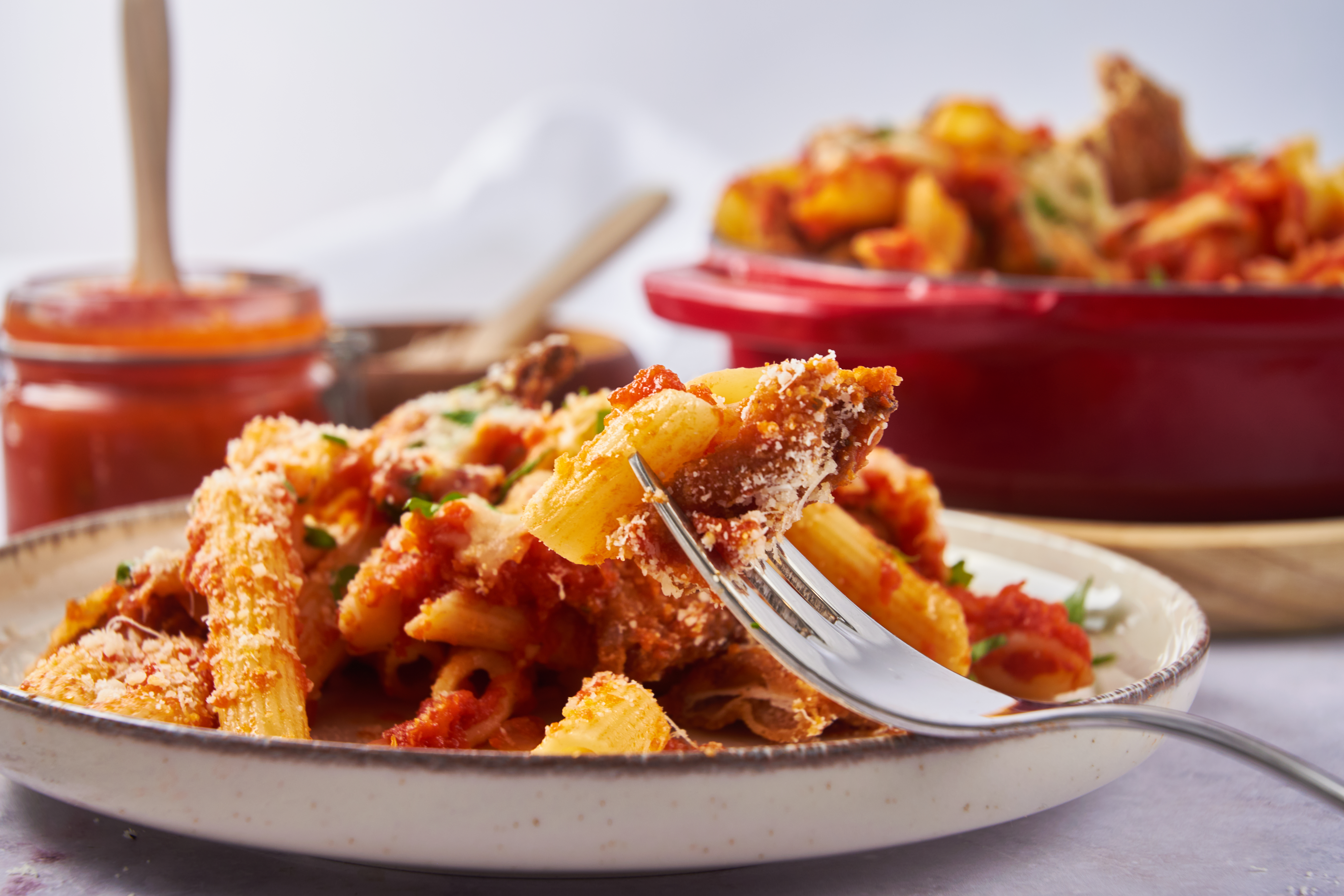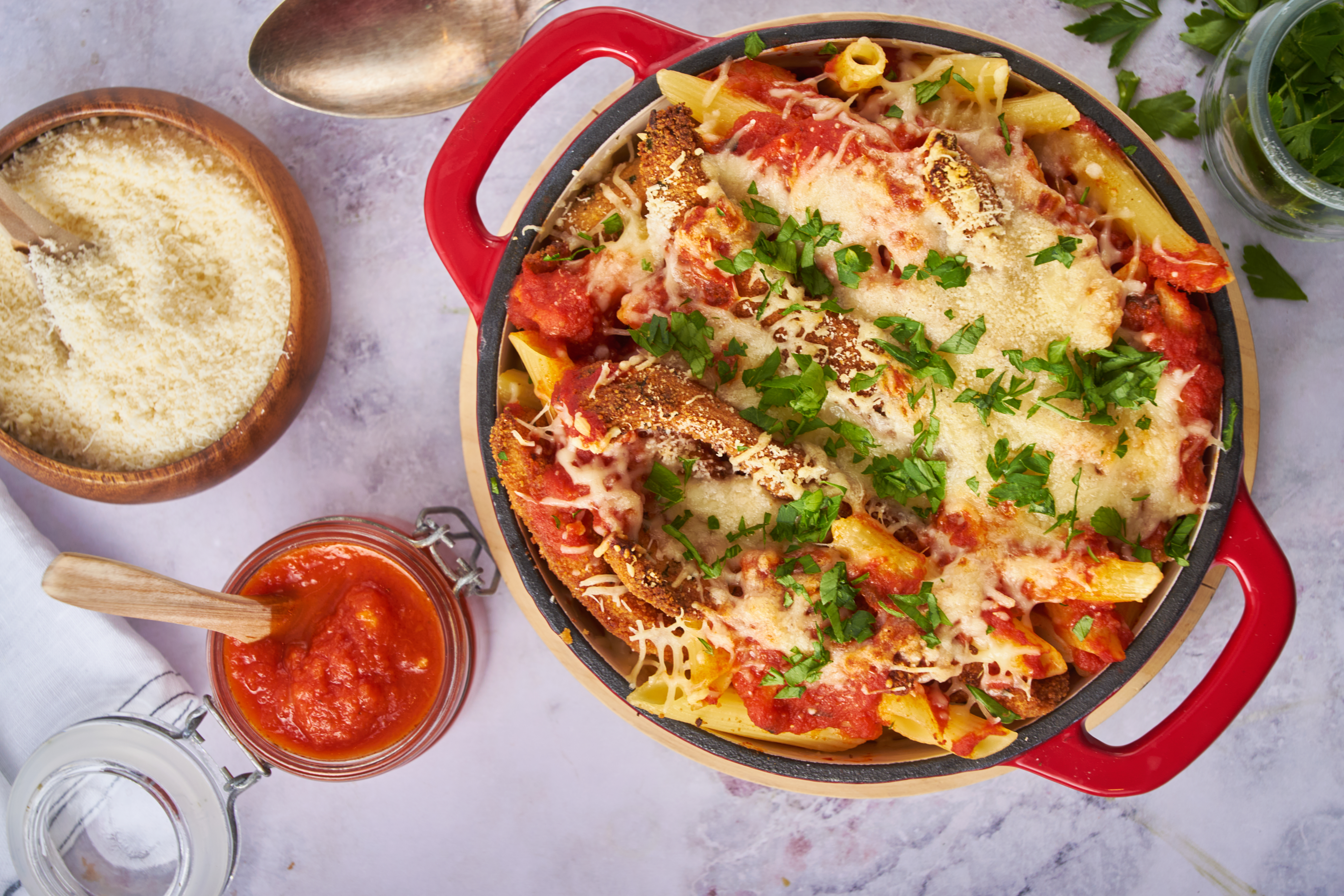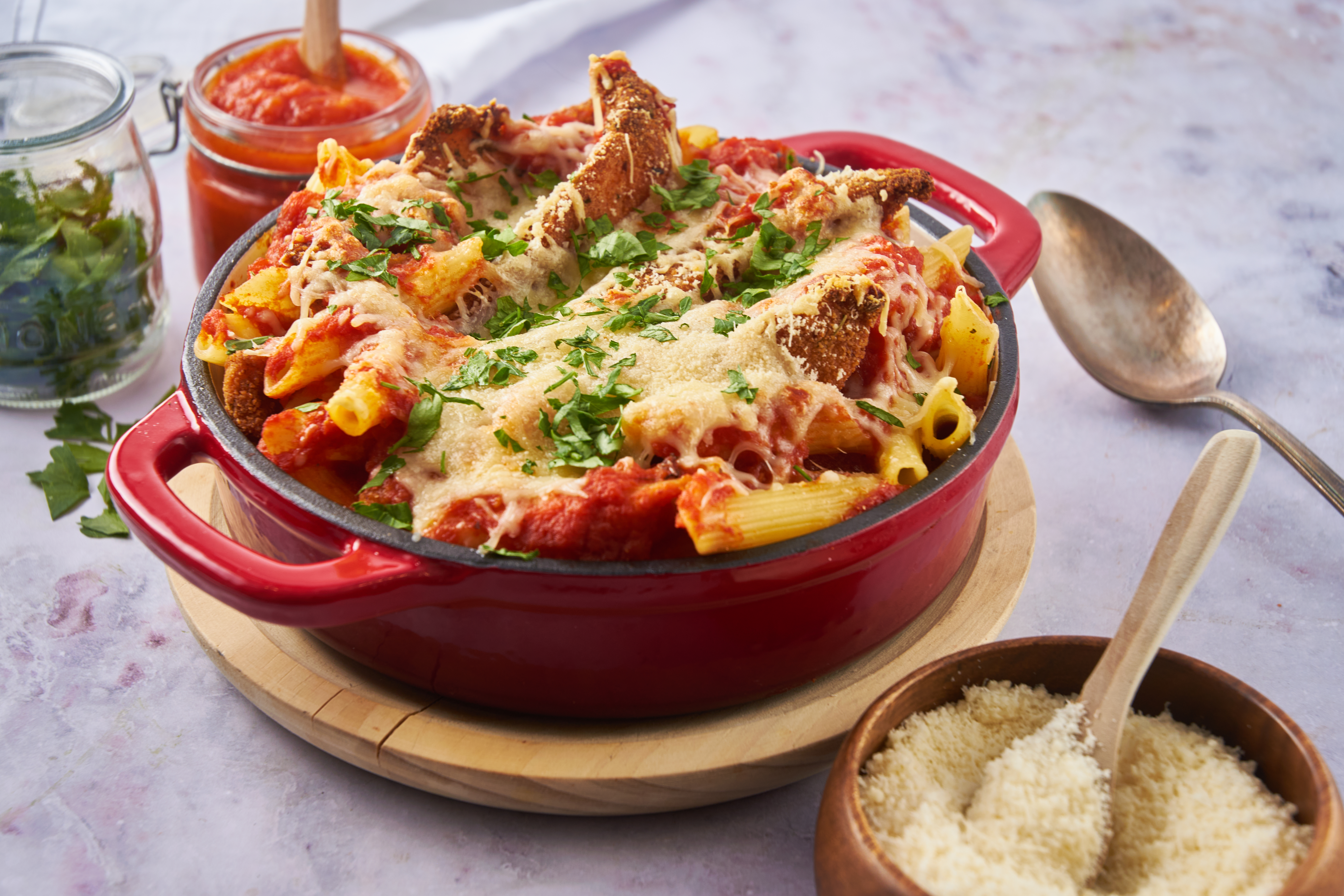 How is this Best Chicken Parm Bake the best? Crispy bites of pan-fried, golden, savory chicken mingling and mixing with melty mozzarella and sharp parmesan is a good place to start. Beds of tender pasta in rich, sweet marinara sauce are another. Bring them both together and the results are awe-inspiring! It's the Best Chicken Parm Bake; it really knows how to make people happy!