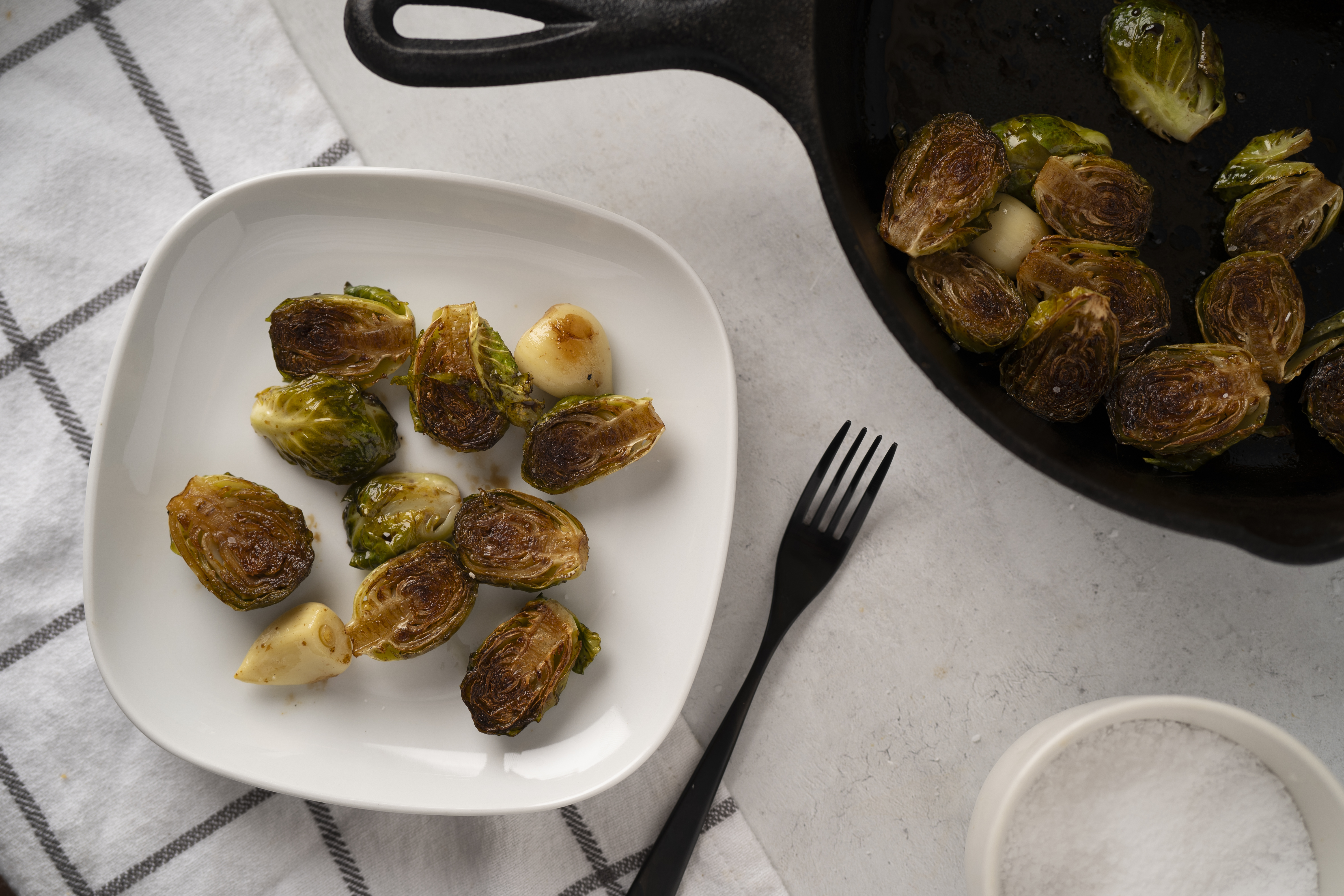 - 1 pound Brussels sprouts, bottoms trimmed and sliced in half vertically