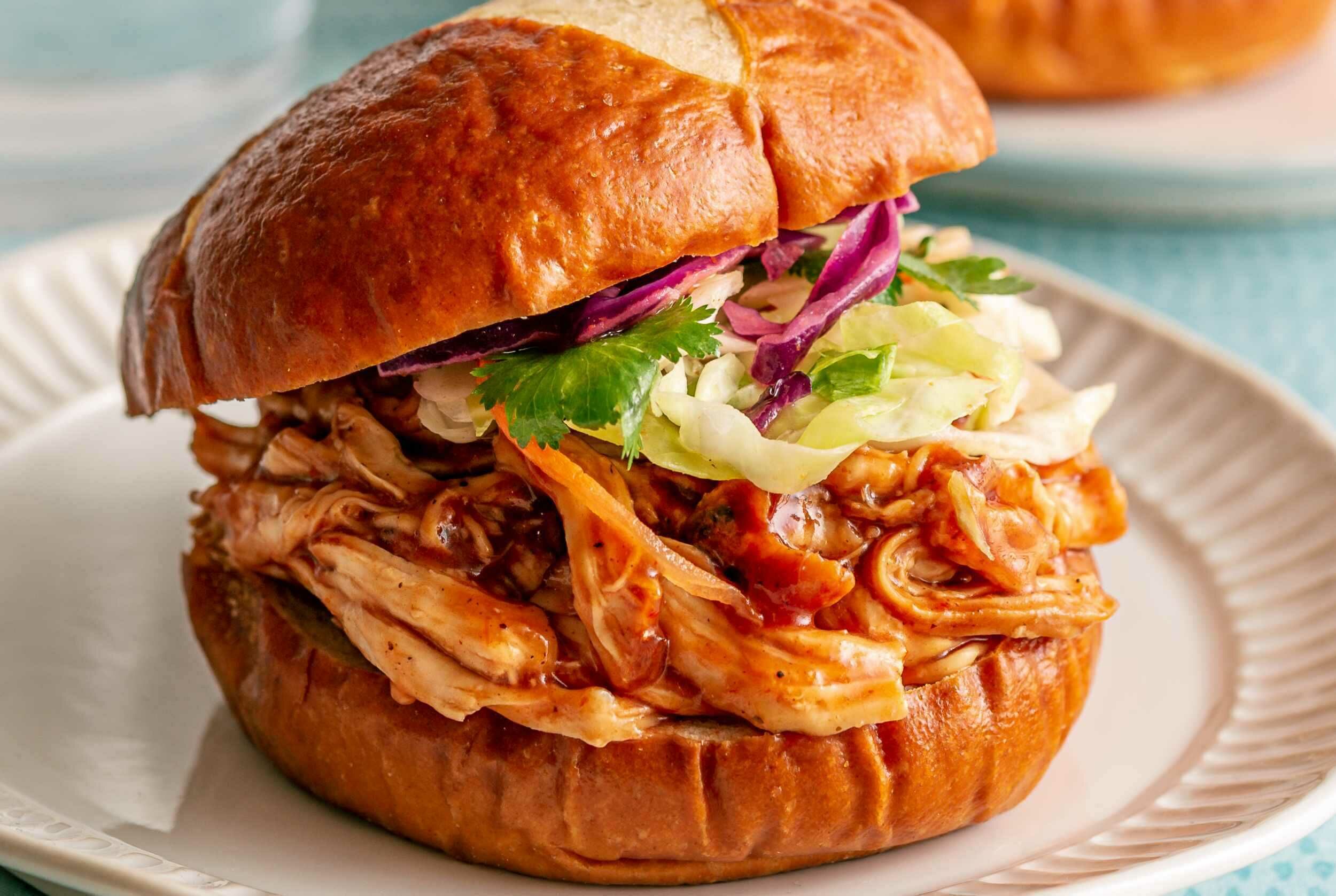 Step 9 -Divide the chicken evenly between the 6 pretzel buns and top each with the coleslaw.