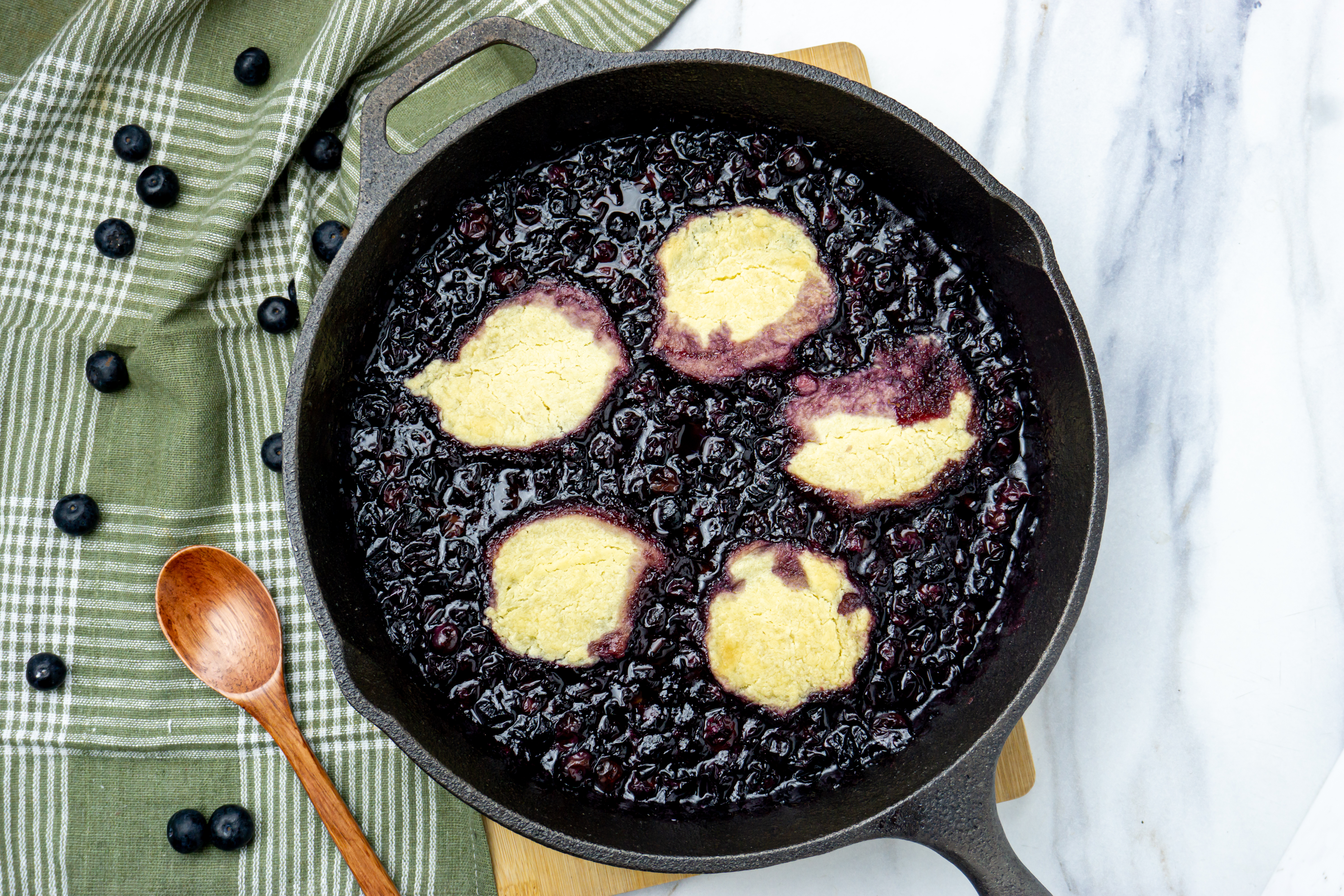 Step 8 -Place the skillet in the oven and bake until the dough is cooked through and browned on top, about 15 minutes. The blueberry syrup should have also thickened.