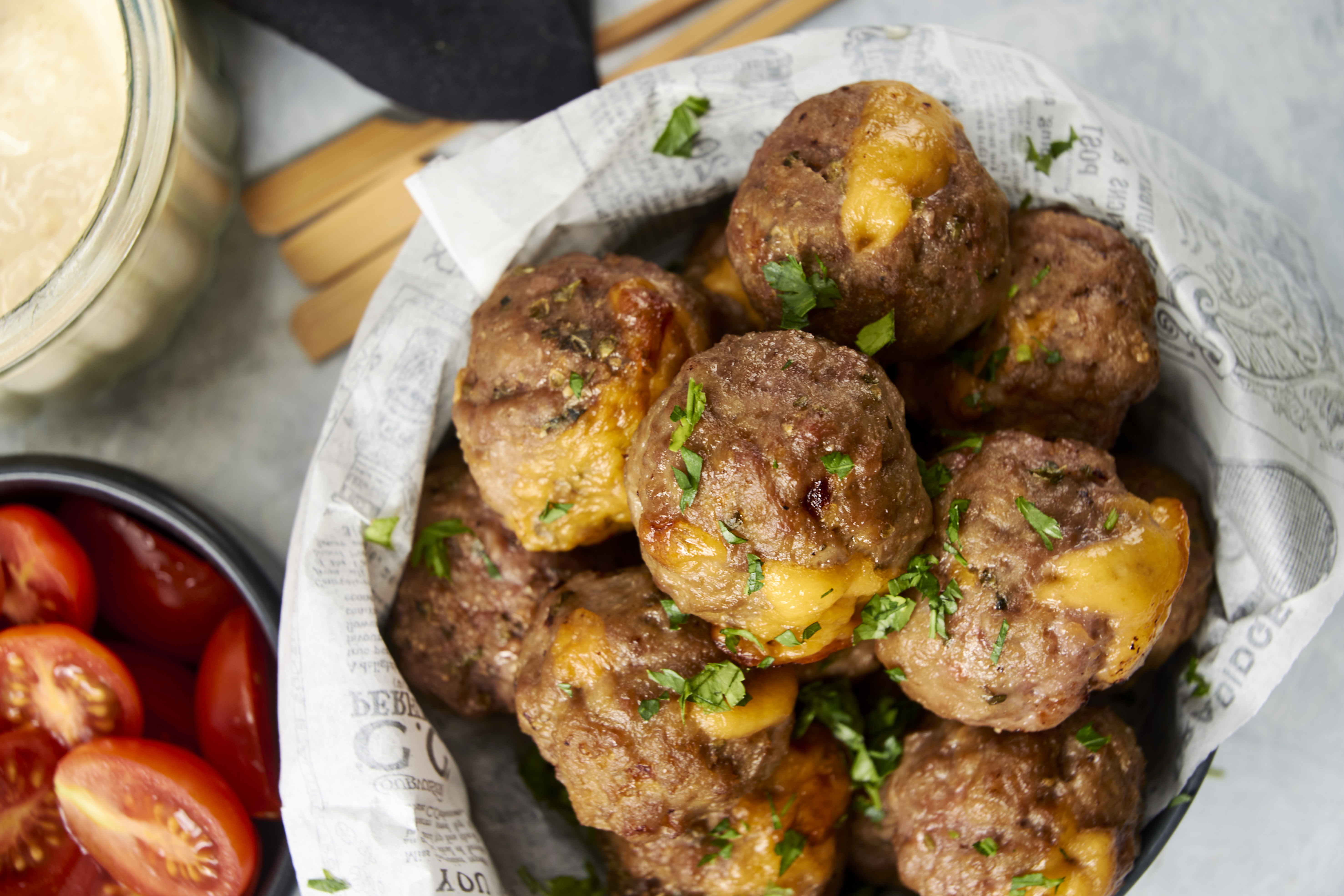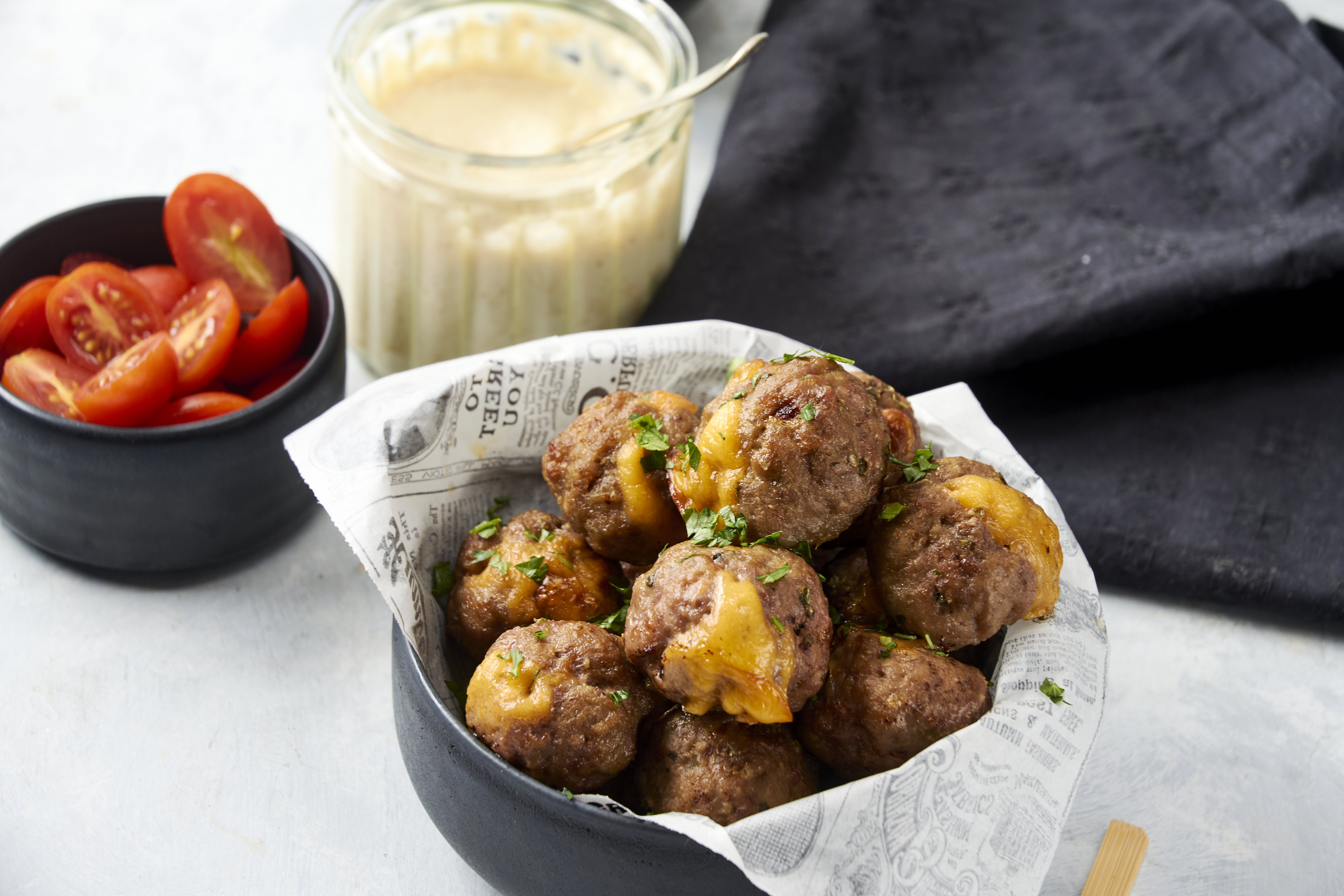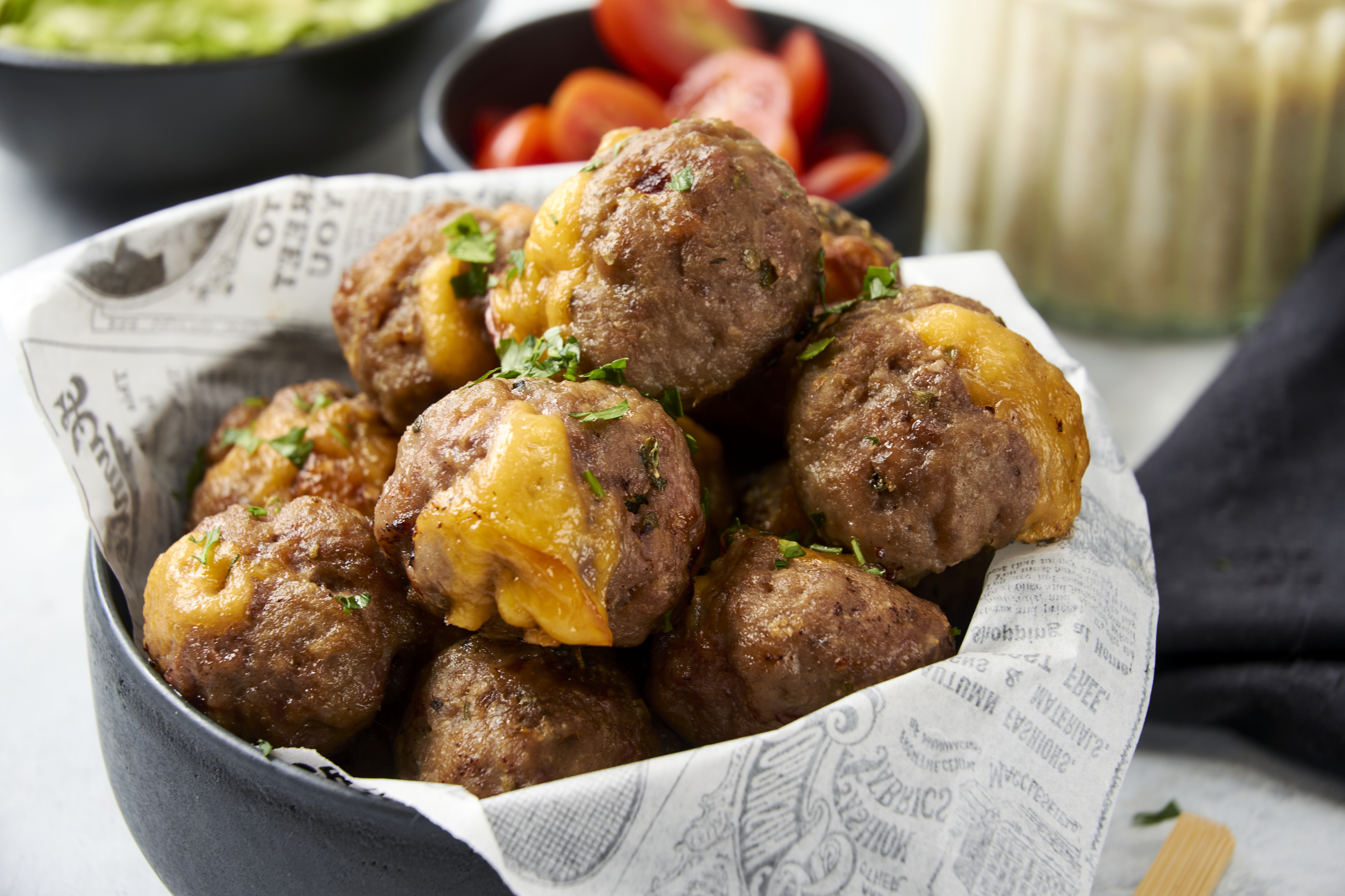 Kaboom! The flavor of Burger Bombs is truly explosive! These yummy, tender, beefy spheres aren't just meatballs; each one is stuffed with melty cheese and, indulgently, a burst of rich melted butter! Butter and beef, is there anything more luxurious? The blast of meaty flavor Burger Bombs bring to the table will blow your mind!
