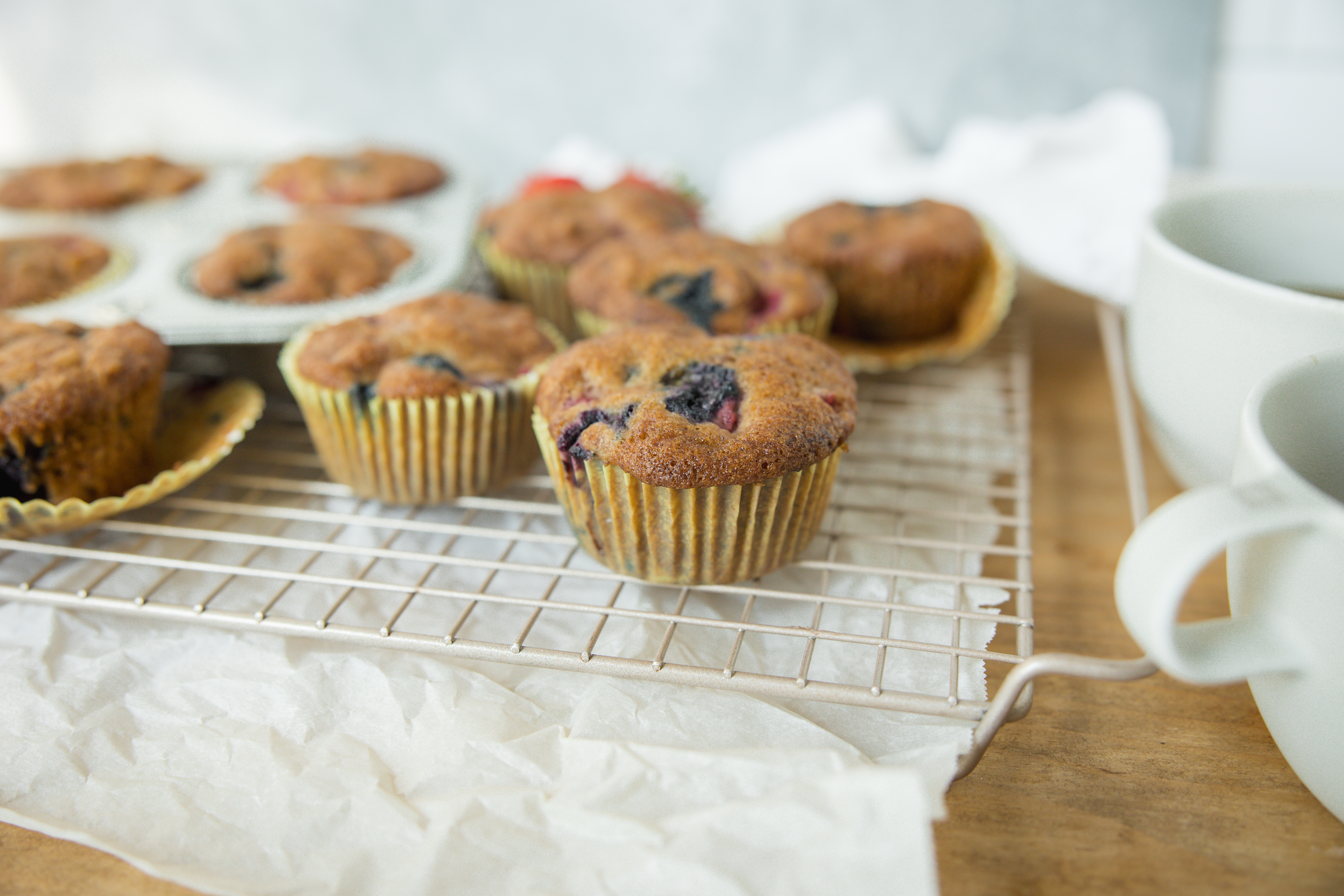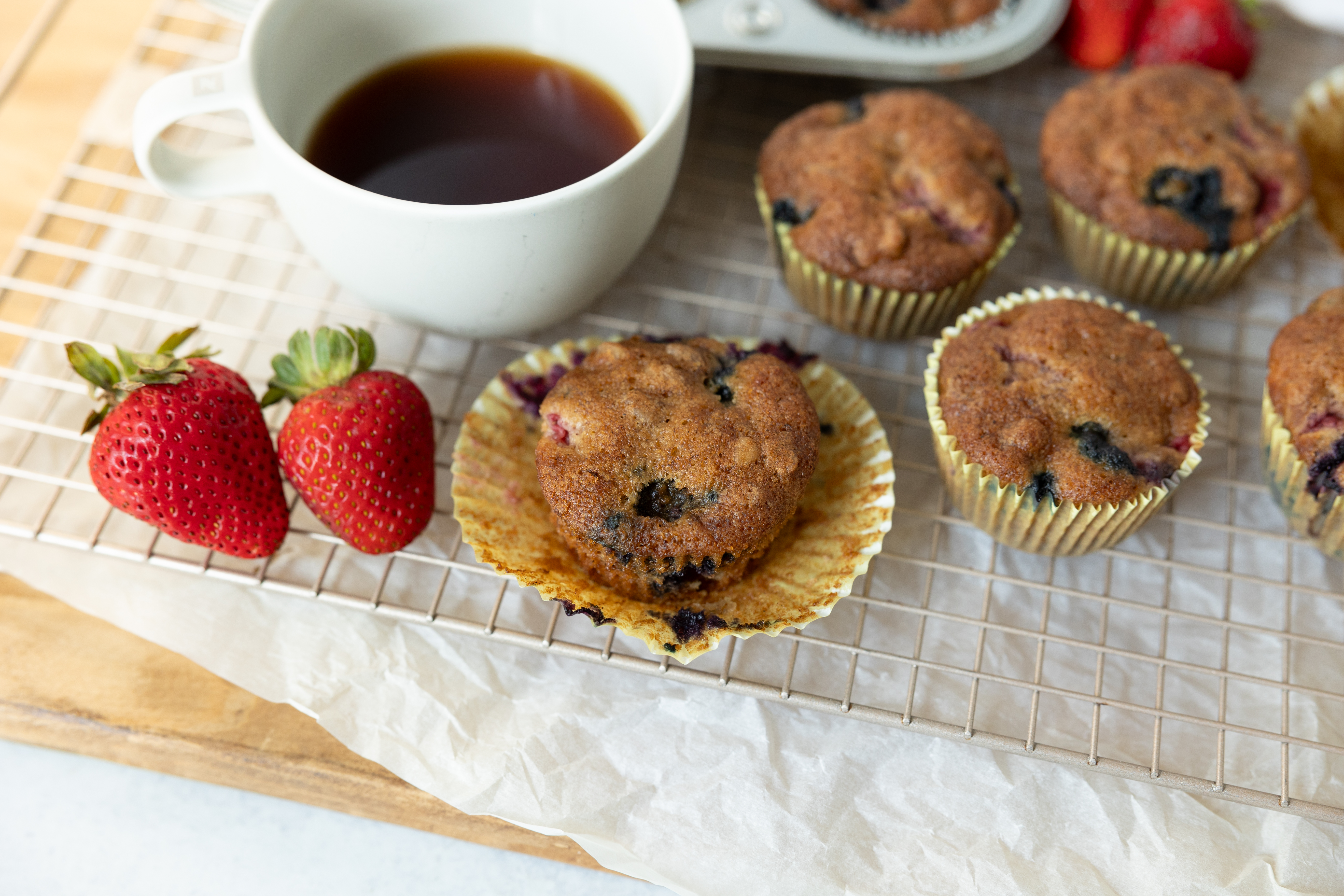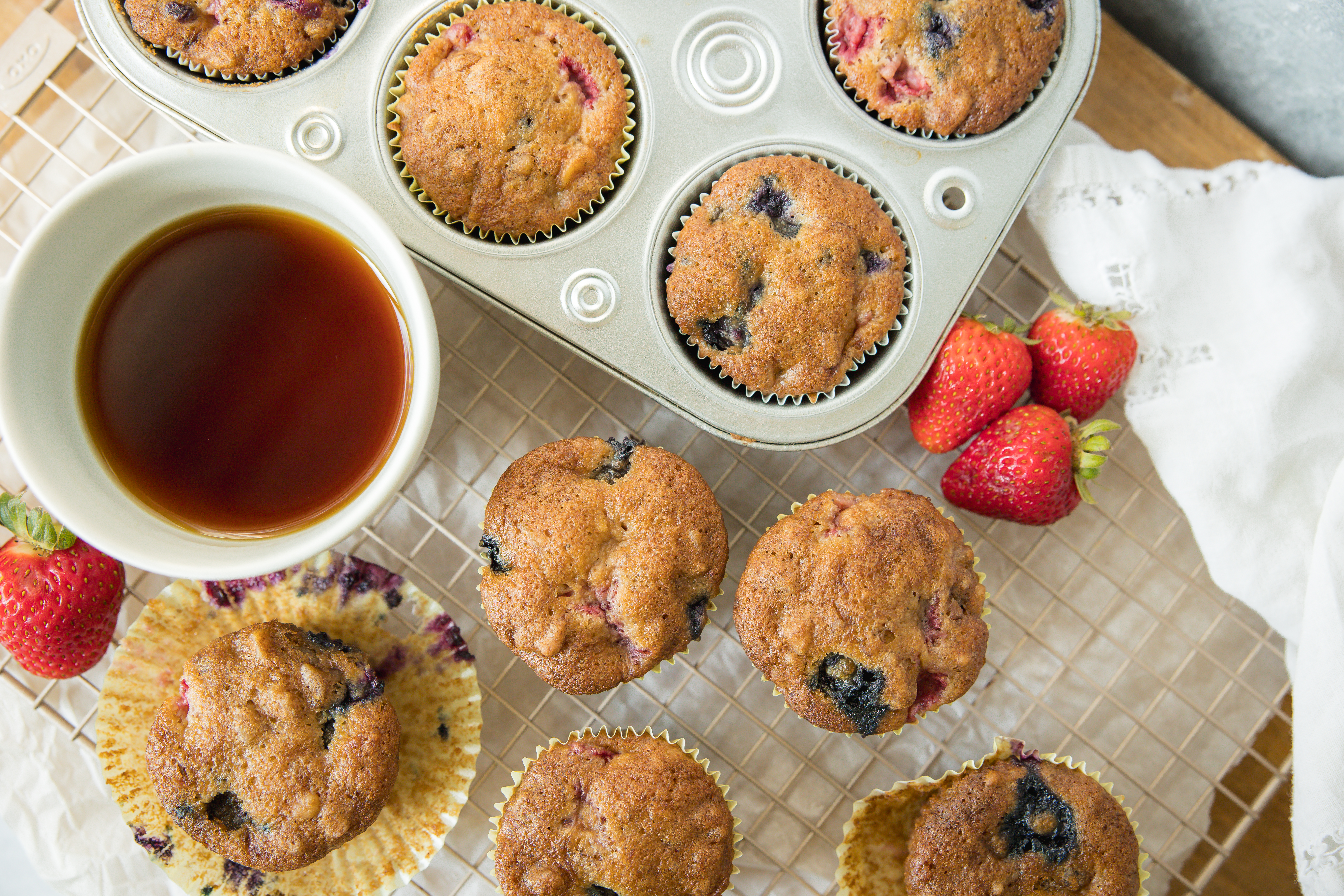 It might be a busy morning, but that's no reason not to indulge a little! Busy Morning Muffins are light, fluffy, and filled with all sorts of goodies, like fresh blueberries, crunchy walnuts, and sweetened strawberries. Busy Morning Muffins are perfect for making ahead of time and grabbing on the go so you can enjoy a tasty treat no matter your schedule. Make your busy day a great day by starting off on the right foot.
