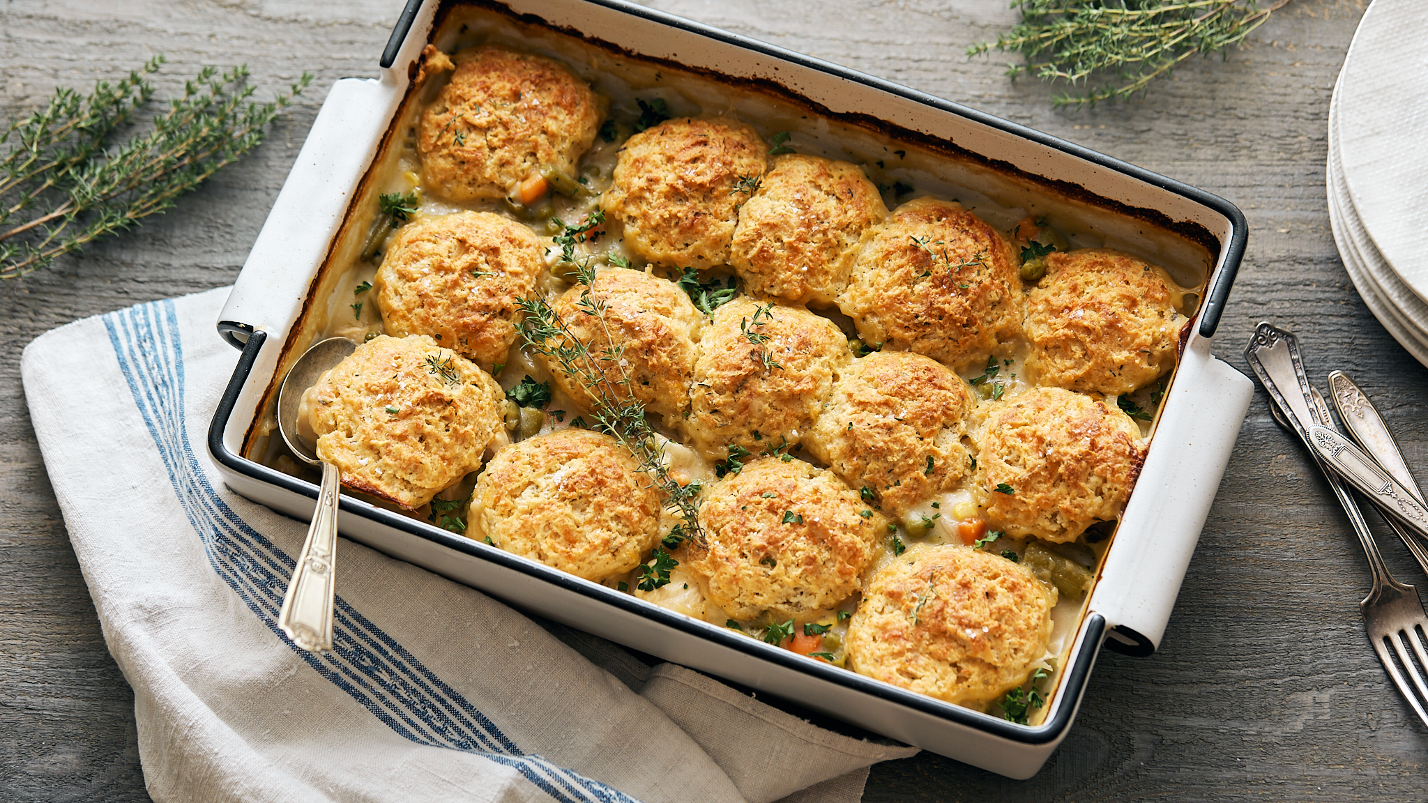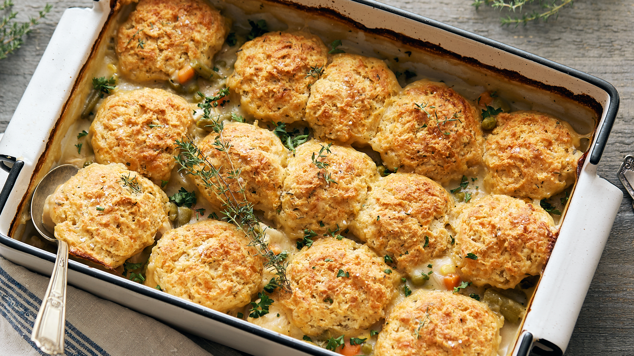 This dish is interesting just from a naming standpoint. It is a casserole, so Chicken Pot Pie Bake definitely fits... but it's also a classic chicken pot pie! Same creamy, savory, rich chicken pot pie sauce filled with succulent chicken and garden-fresh veggies! Same buttery, flaky, biscuit crust with wonderful herbaceous flavor and even a little cheese! So, is Chicken Pot Pie Bake a chicken pot pie or a true casserole? Oh well, when something tastes this good, who cares what it's called?