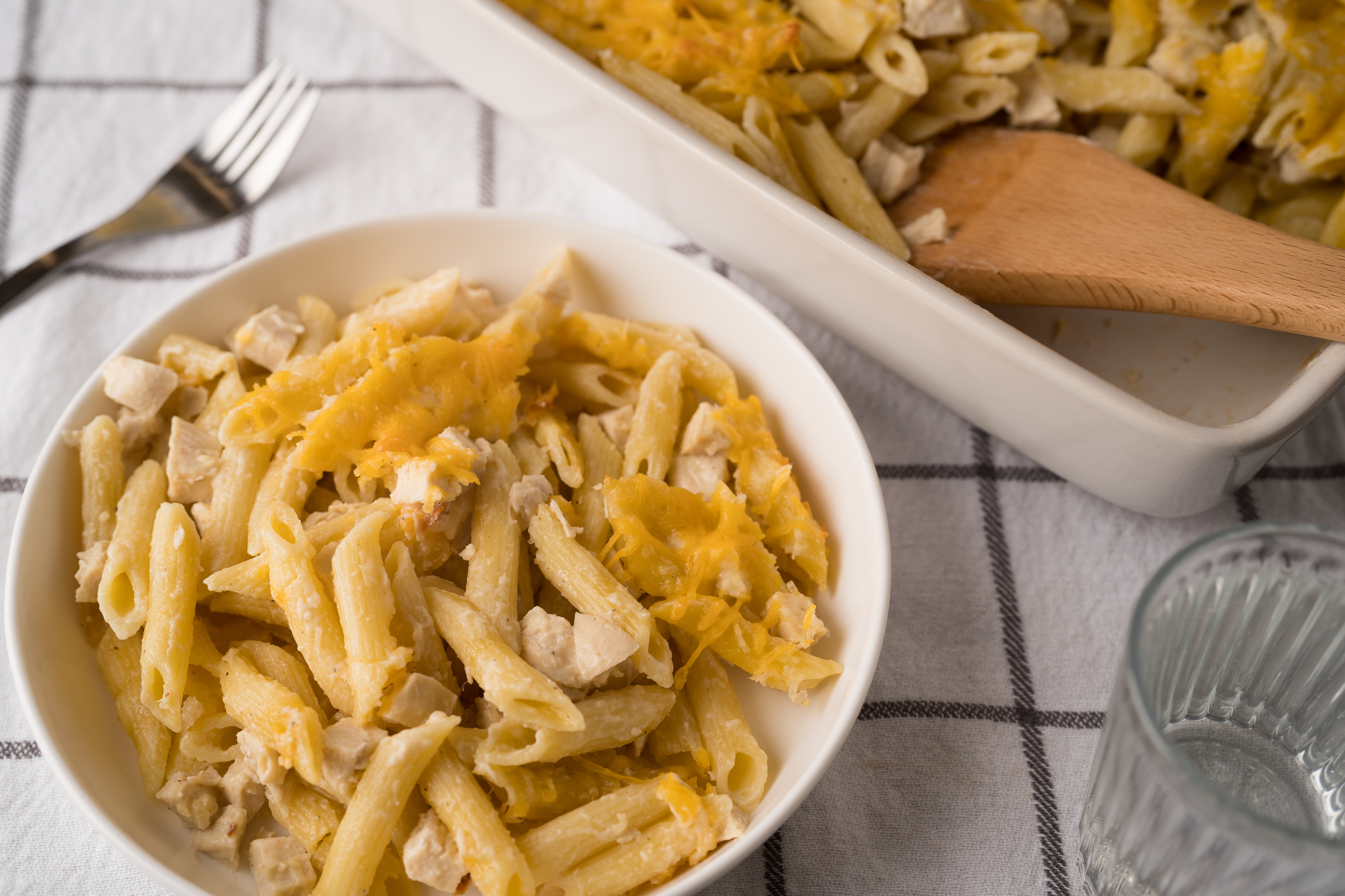 Step 8 -In a large bowl, add the cooked chicken, the cooked penne, the Alfredo sauce, 1/2 of the mozzarella cheese, the milk, the onion powder, and the garlic powder and mix well.