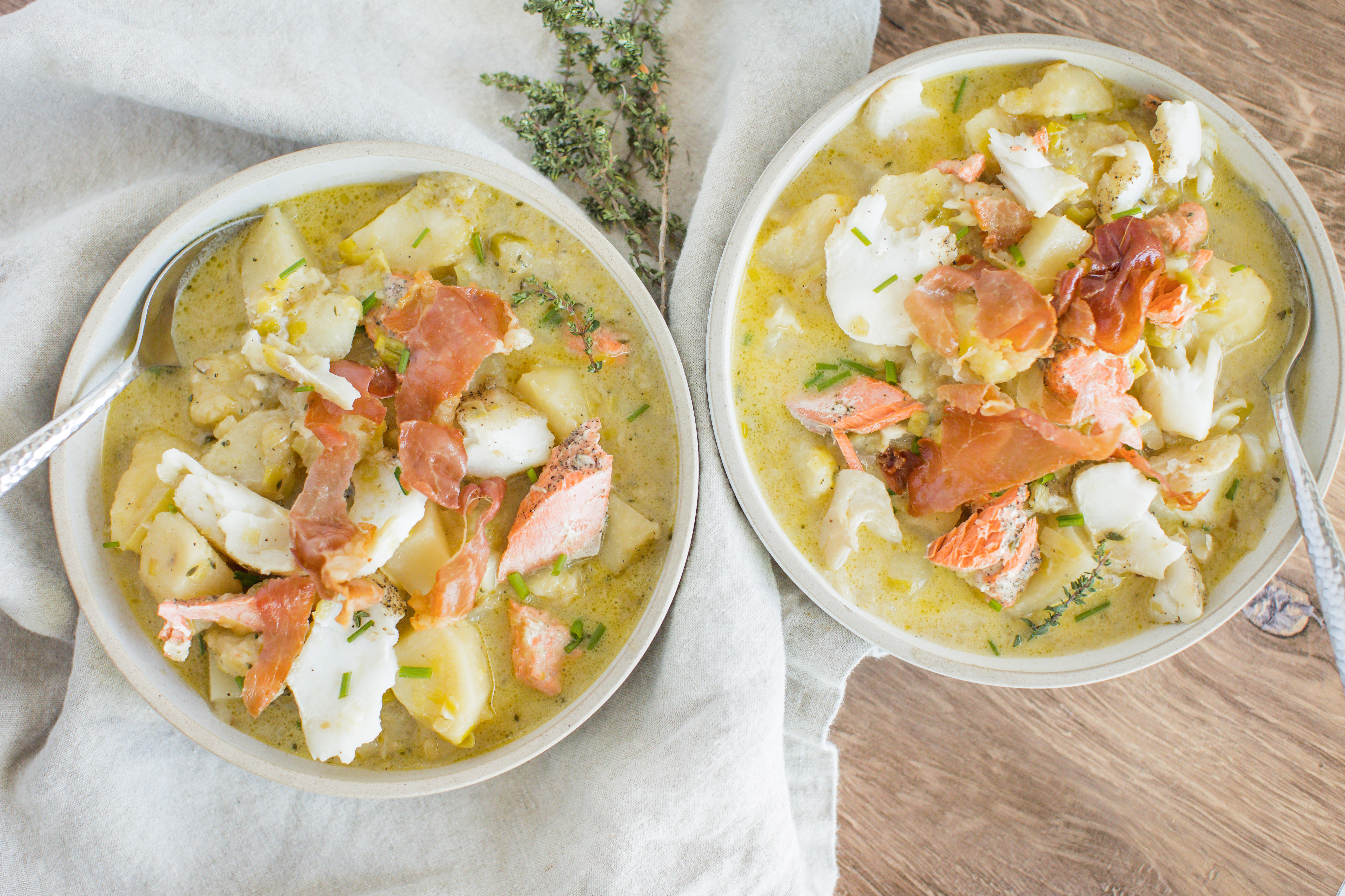 Step 17 -Transfer the potatoes and the fish to wide, shallow individual serving bowls, allowing the fish to break into pieces. Top with the broth, the chives, the extra thyme leaves, and the crisp prosciutto.