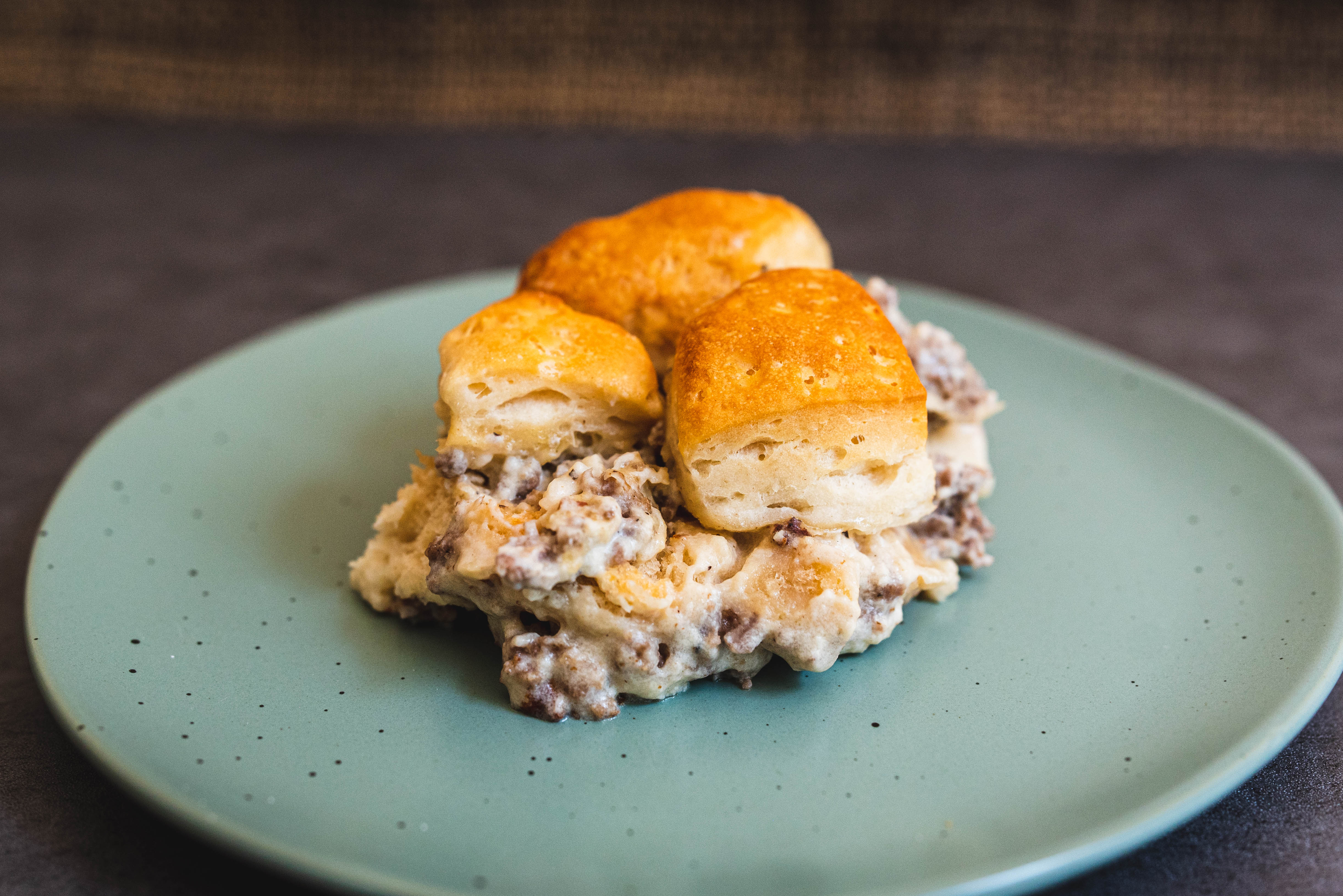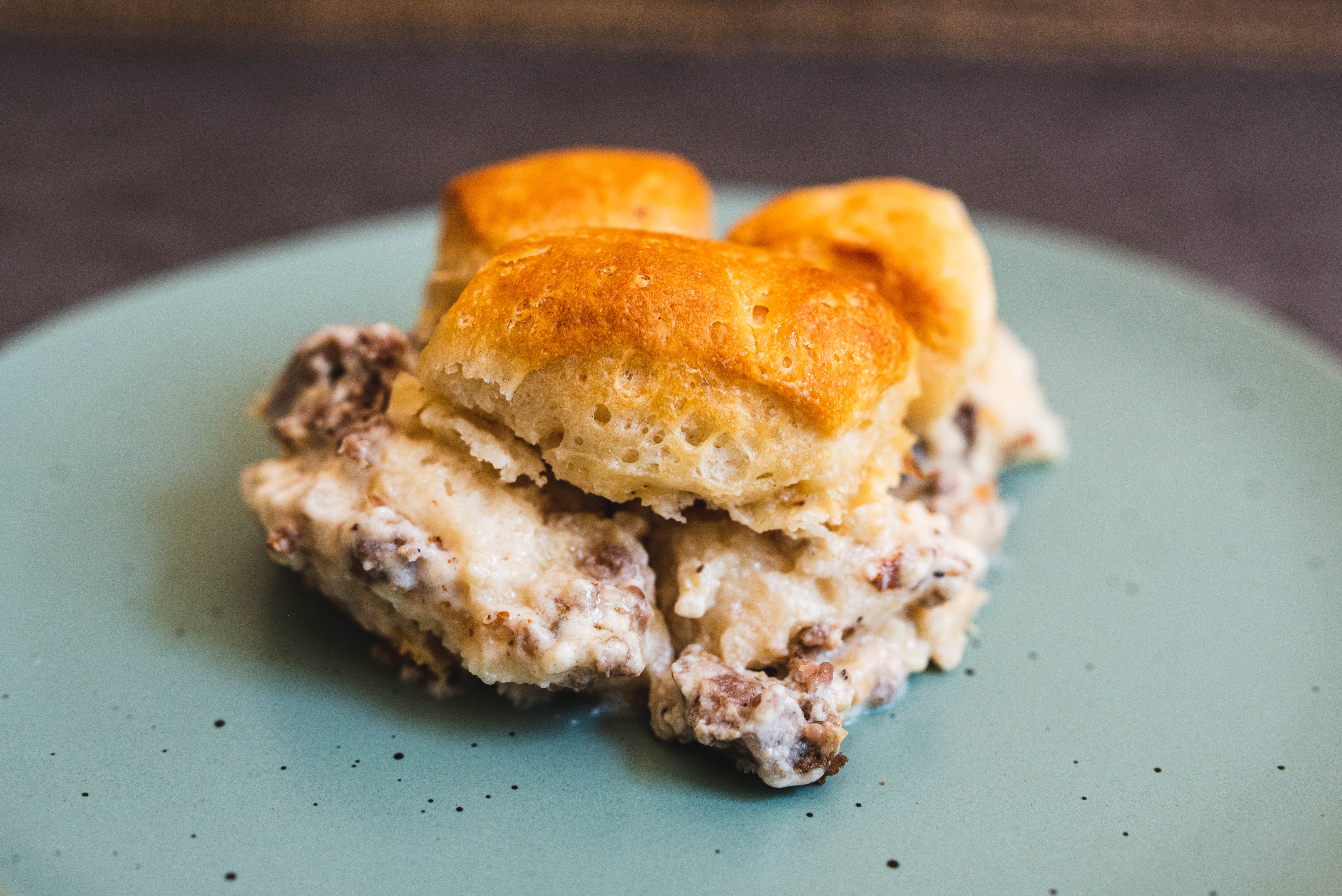You've never had biscuits and gravy like this! This Down-Home Breakfast Bake starts with a layer of golden-brown, flaky, buttery biscuits and then dives into a creamy, savory, meaty gravy that's loaded with sausage. And below that? Even more biscuits! That's right, Down-Home Breakfast Bake nestles the buttery goodness right in the gravy! Grab your forks and dig in!