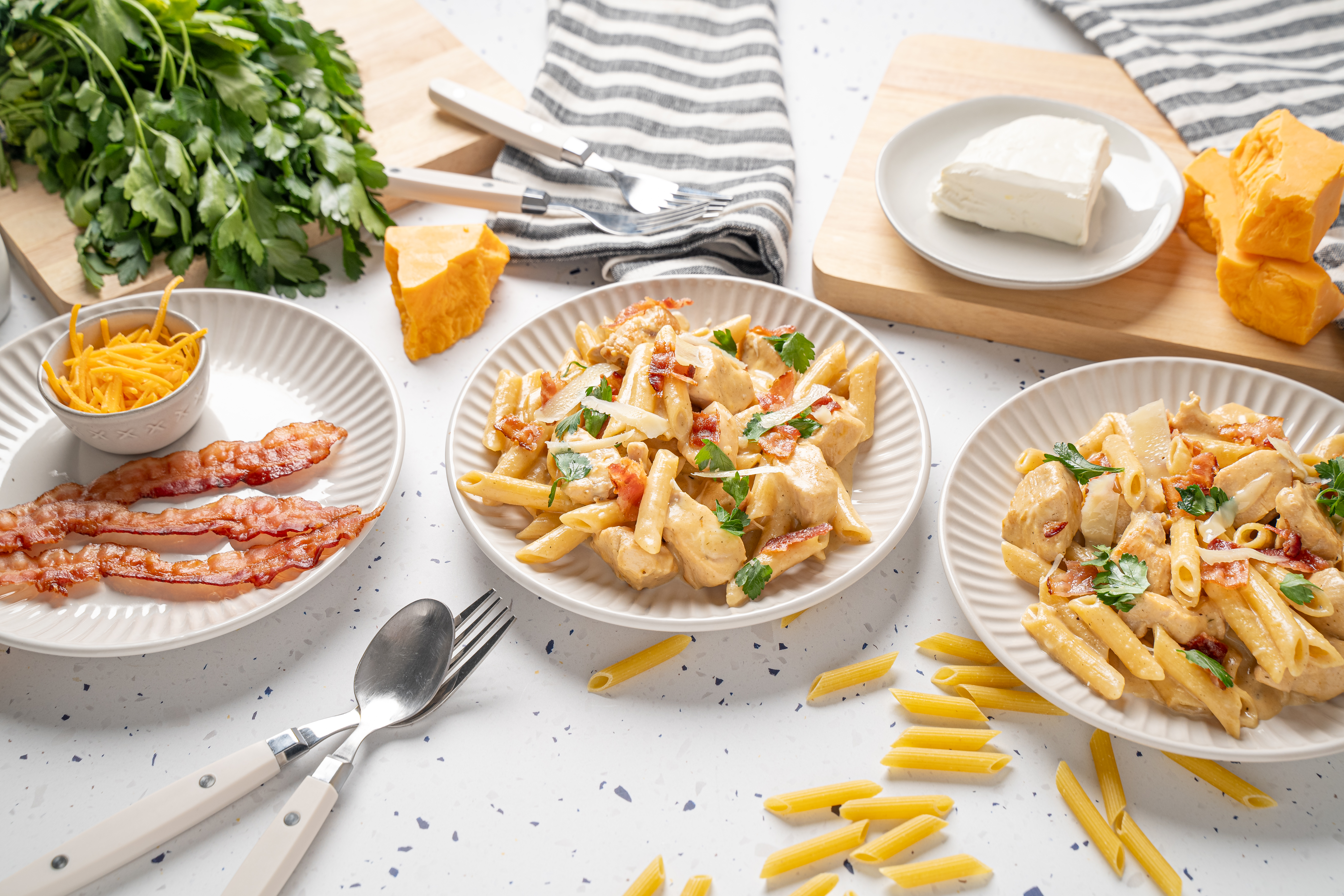 This crave-worthy chicken dinner is something else, that is for sure! Complete with crumbled bacon and melted cheese, Easy Crack Chicken Pasta features bite-sized pieces of savory chicken mingling and mixing with tender pasta in a creamy, tangy cheese sauce! Zesty ranch seasoning makes this cheese and chicken masterpiece even more compelling! Easy Crack Chicken Pasta will have you coming back for more because it's impossible to resist!