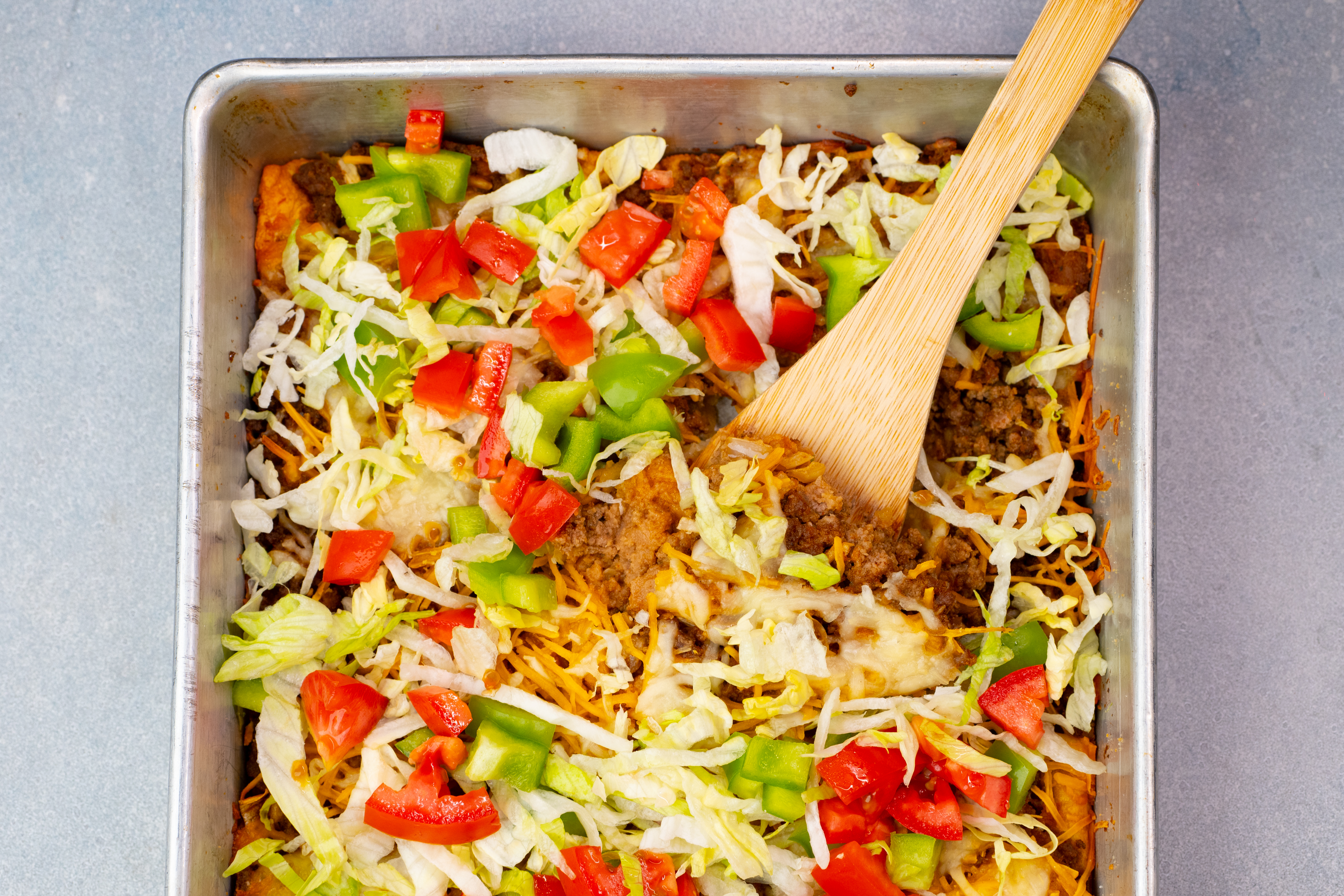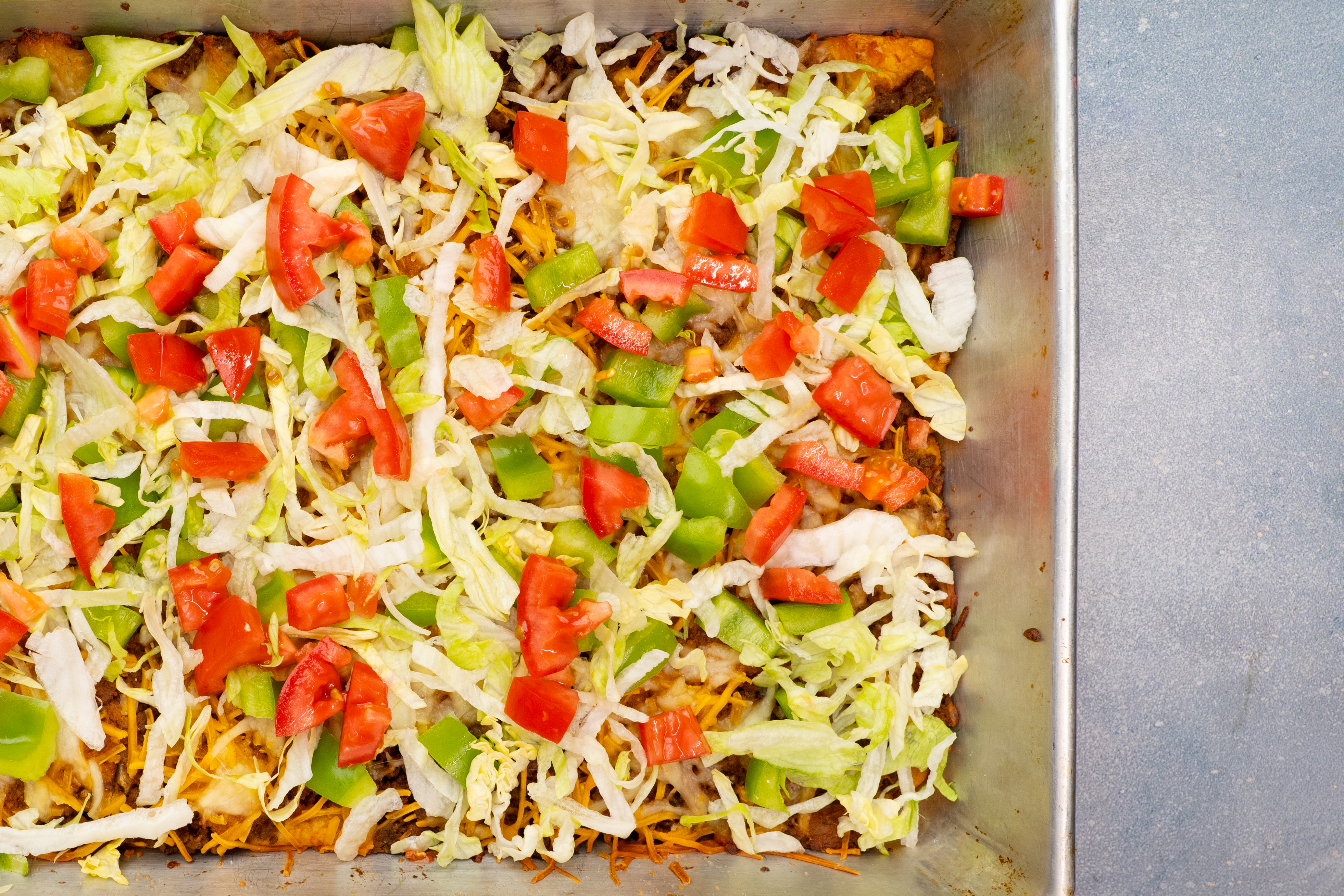 Step 9 -Sprinkle the green pepper, red pepper, the lettuce, and the tomatoes over the top of the burrito bake.