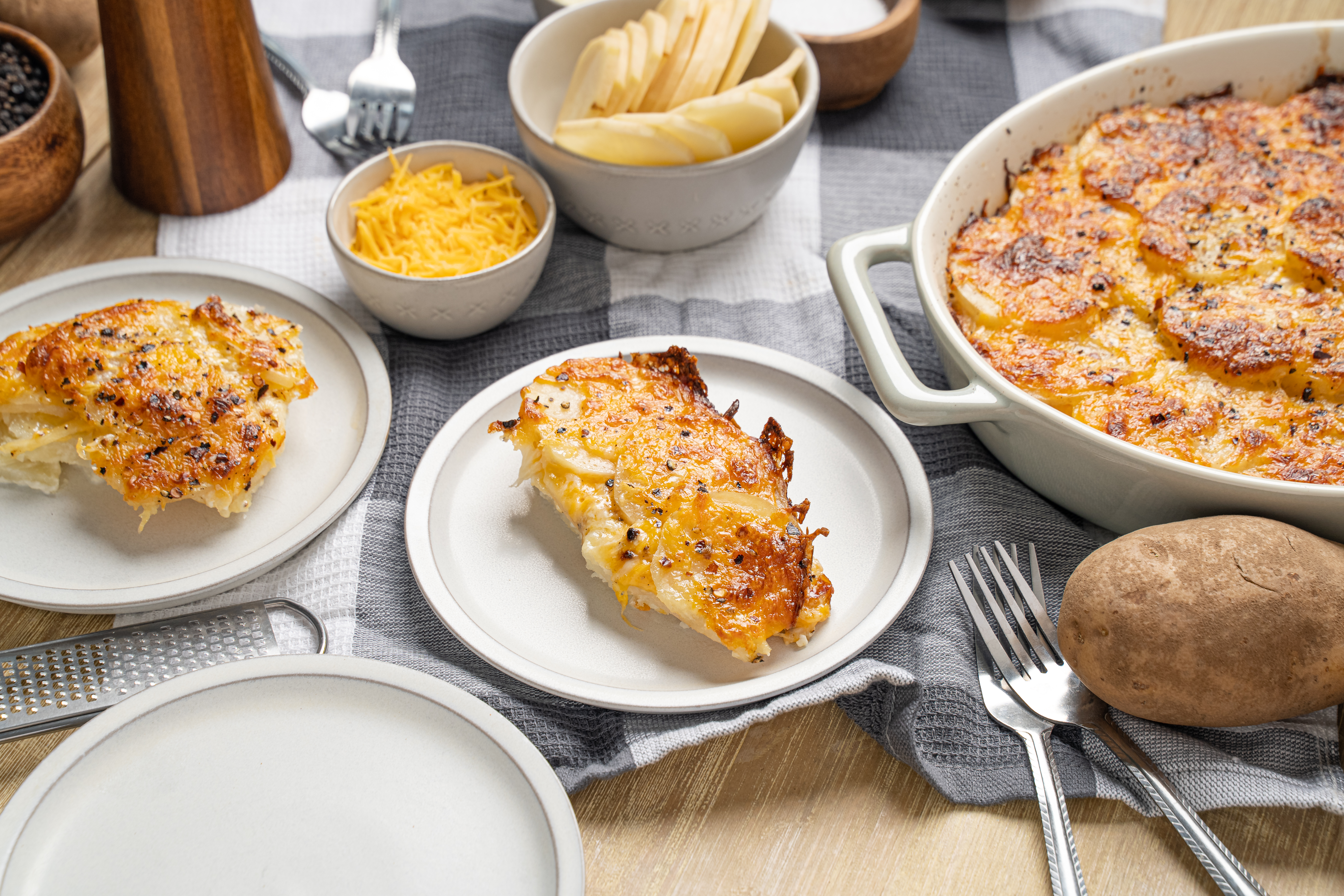 Step 8 -Bake the cheesy potatoes until the potatoes are fork tender and the top is golden, about 50 minutes-1 hour.