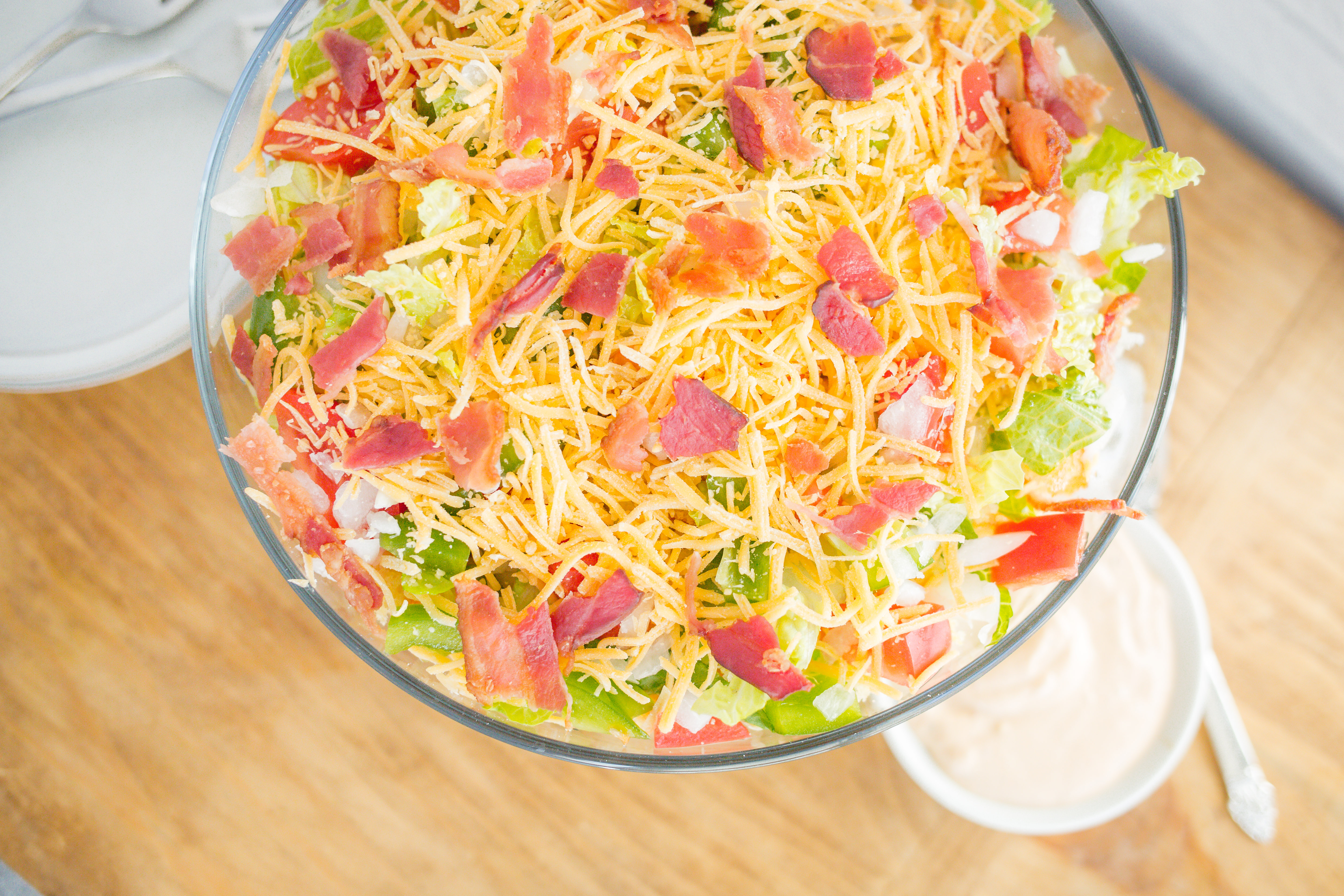 Step 9 -In a 3-quart trifle bowl or a glass bowl, layer 1/3 of the cornbread, 1/2 of the romaine, 1/2 of the tomatoes, 1/2 of the green pepper, 1/2 of the onion, 1/2 of the bacon, 1/2 of the cheese, and 1/2 of the mayo mixture.