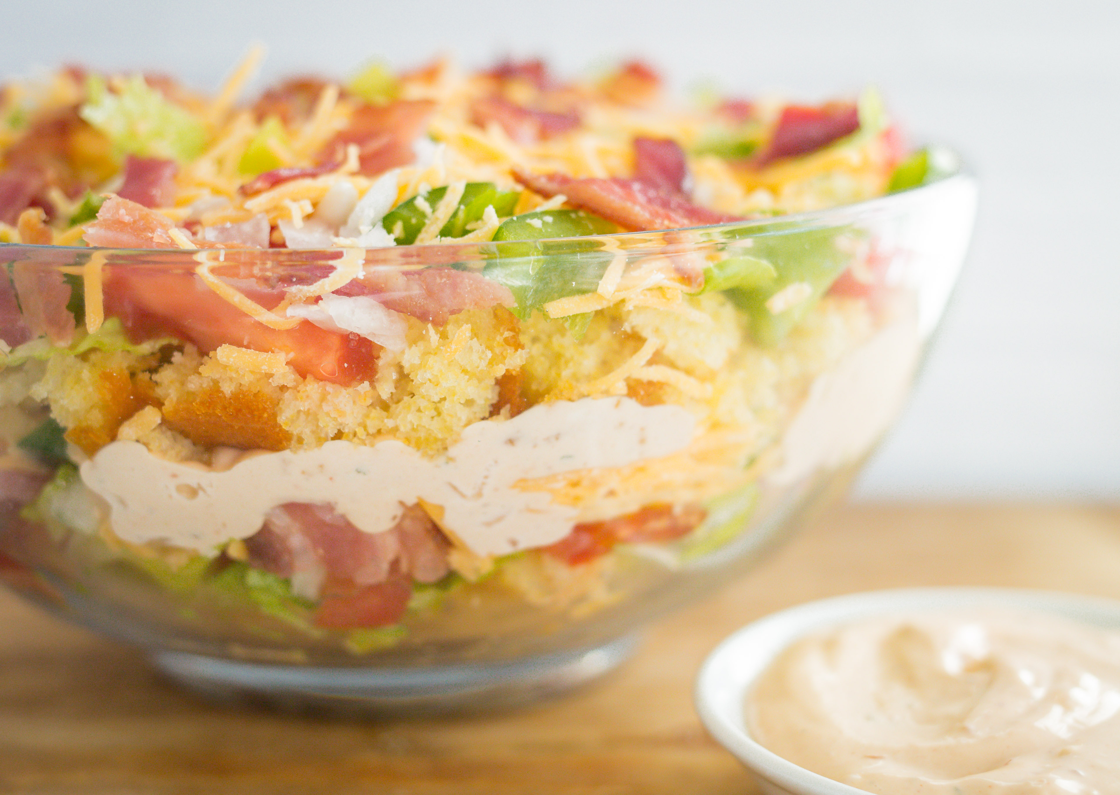 The layered salad you know now comes with a little Southwestern kick! Sunny, crumbly, and delightfully sweet cornbread forms the backbone of the colorful stripes in this Layered Cornbread Salad, upholding bands of fresh veggies, crunchy succulent bacon, and sharp cheddar cheese. The dressing combines tangy mayo, zesty ranch, and spicy adobo sauce to ensure every bite is livened up and ready for prime time! Layered Cornbread Salad lets you taste a rainbow of amazing tastes!