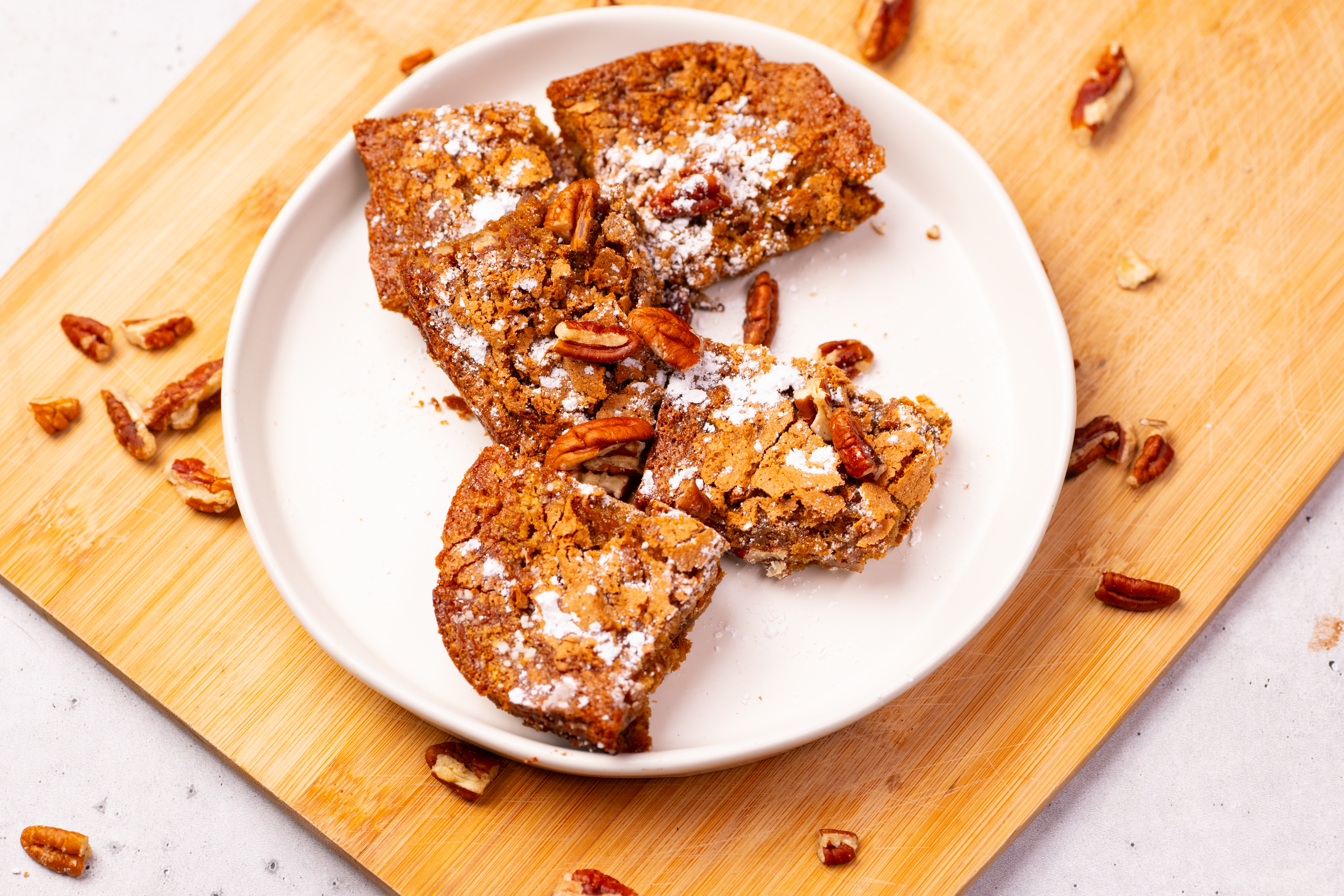 If you're not in the mood to bake a whole pie, we totally get it! It takes a lot of work. However, if you can't seem to shake the pie craving, then we've got you covered. Lazy Pecan Pie Bars are here for the rescue! These crispy-on-the-outside, moist-on-the-inside squares are basically everything you love about the caramel-y, nutty pecan pie, but without having to exhaust yourself and make a crust. You essentially mix it all together, dump it in a dish, and bake! Easy-peazy. Perfect for holidays or any cool day in between, it makes you wonder why these Lazy Pecan Pie Bars aren't on everyone's dessert rotation?!