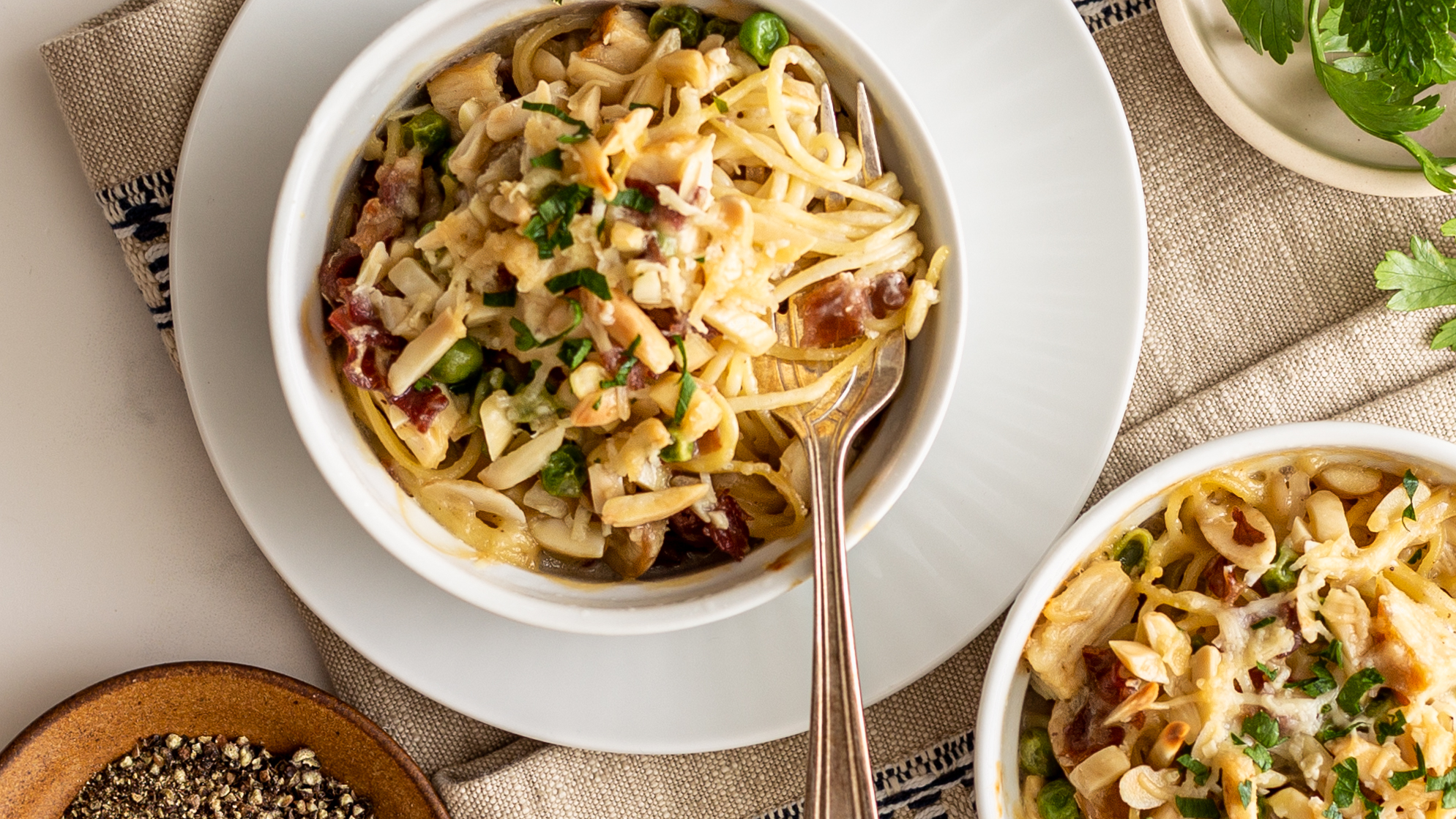If you're looking for a load of great flavor, this Loaded Tetrazzini Bake is for you! We've pretty much jammed everything we could possibly fit into the baking dish to make sure your belly is totally filled and satisfied. There is twirly vermicelli pasta, crispy prosciutto, tender baby English peas, earthy mushrooms, and a creamy, rich sauce... does that sound like that'll do the trick?! It definitely did for us. The next time hunger strikes and not just any meal will do, fill up with this Loaded Tetrazzini Bake!