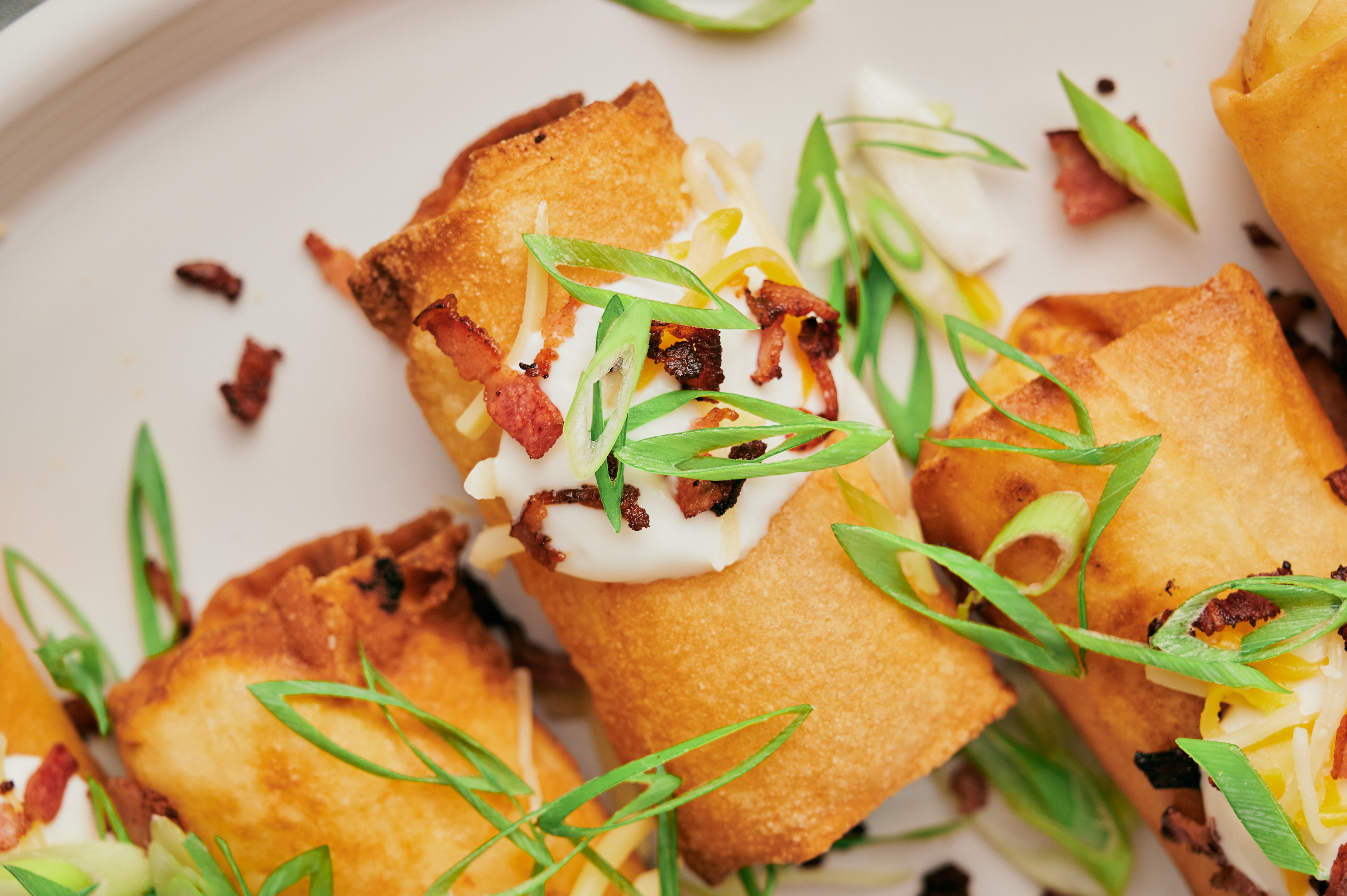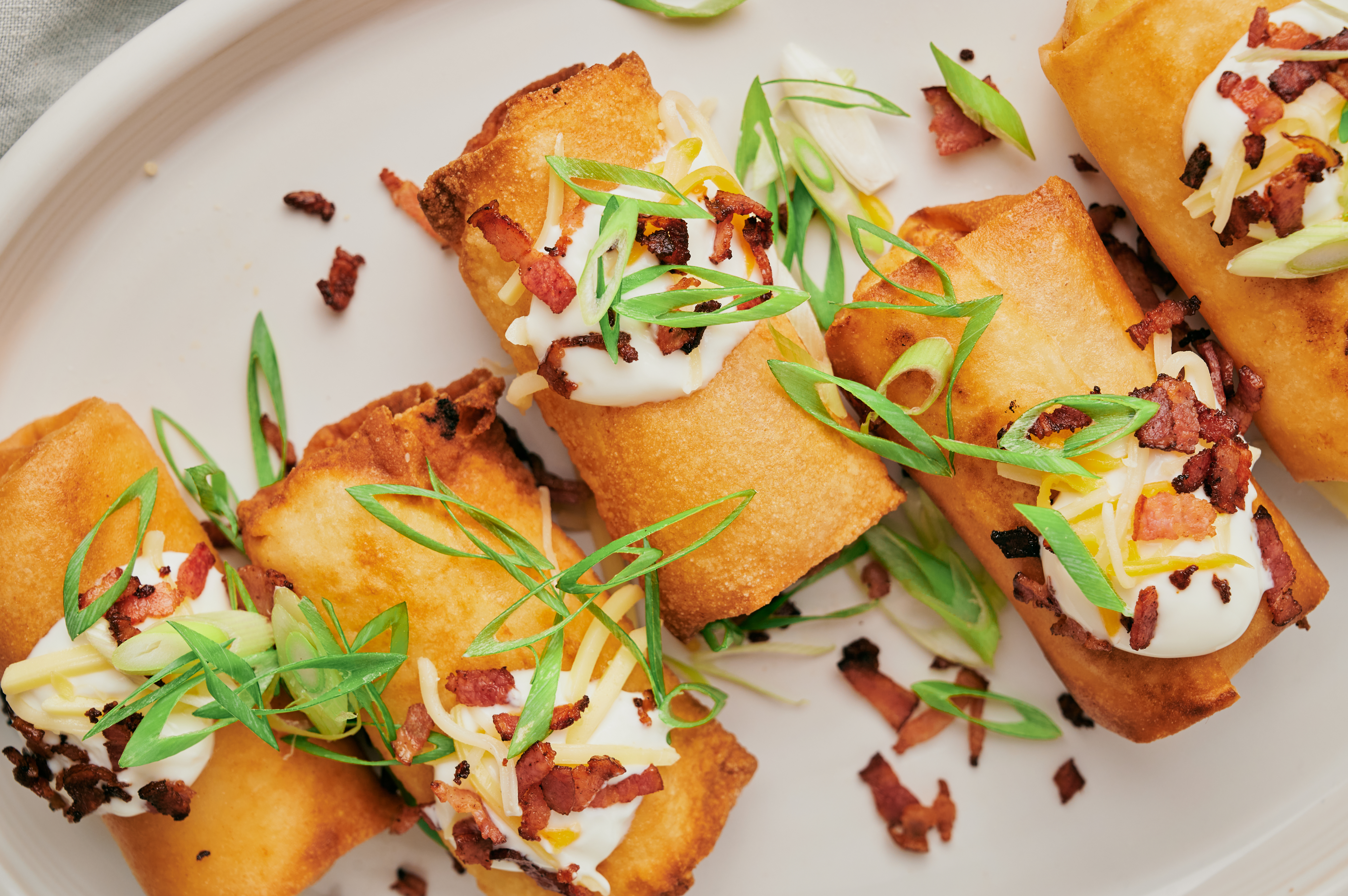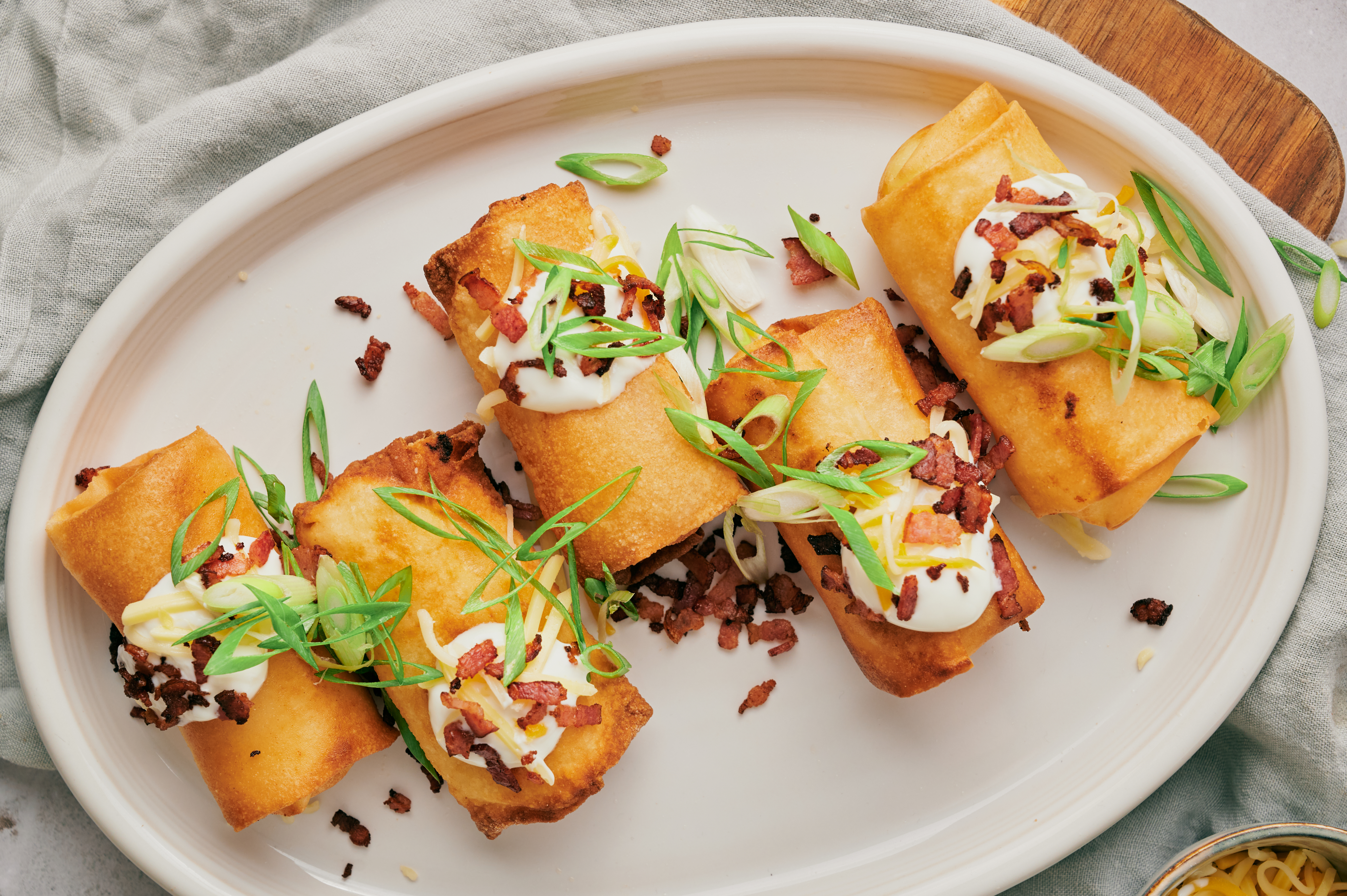 Step 19 -Serve the spring rolls with the sour cream, the bacon bits, the green onions, and the shredded cheese.