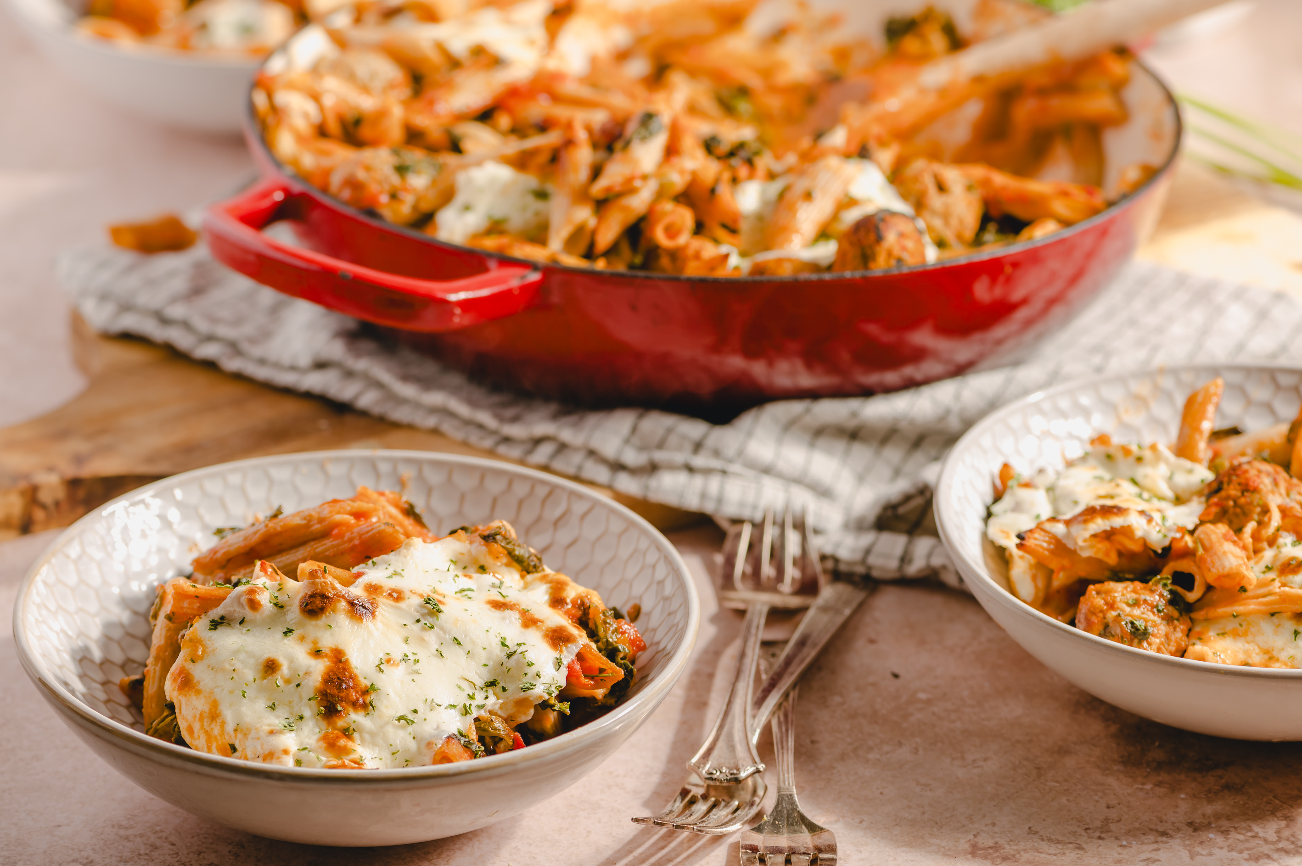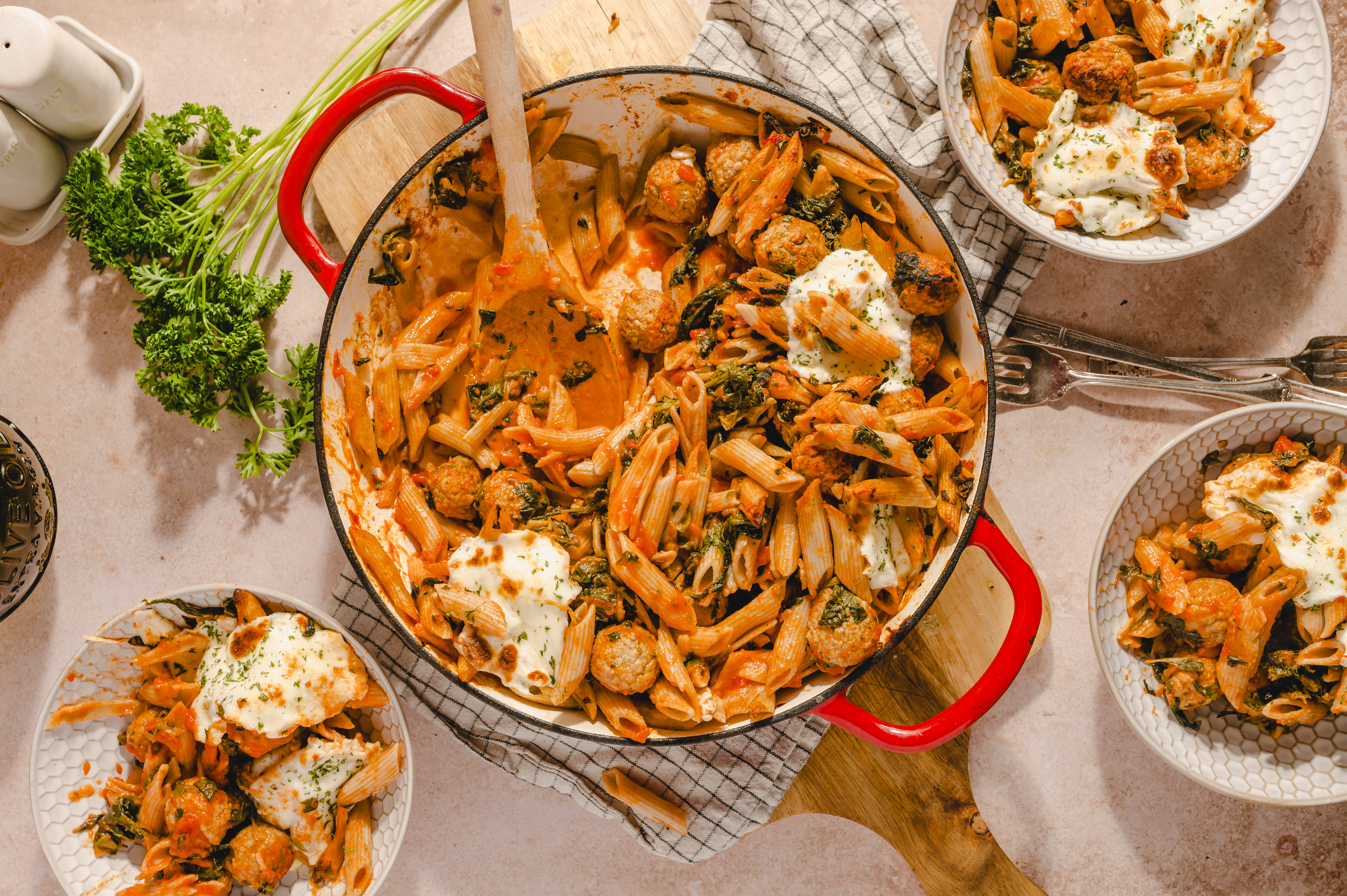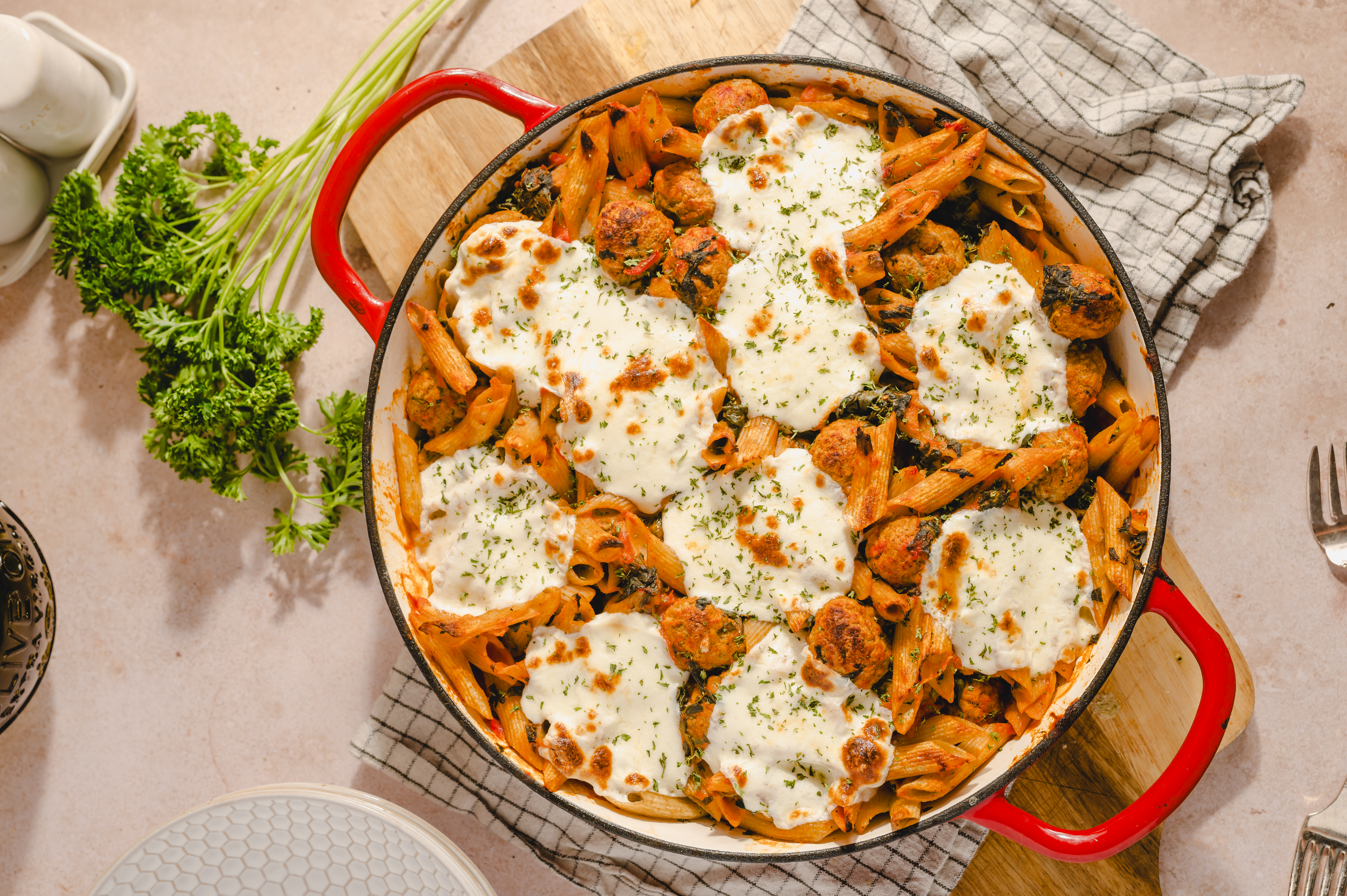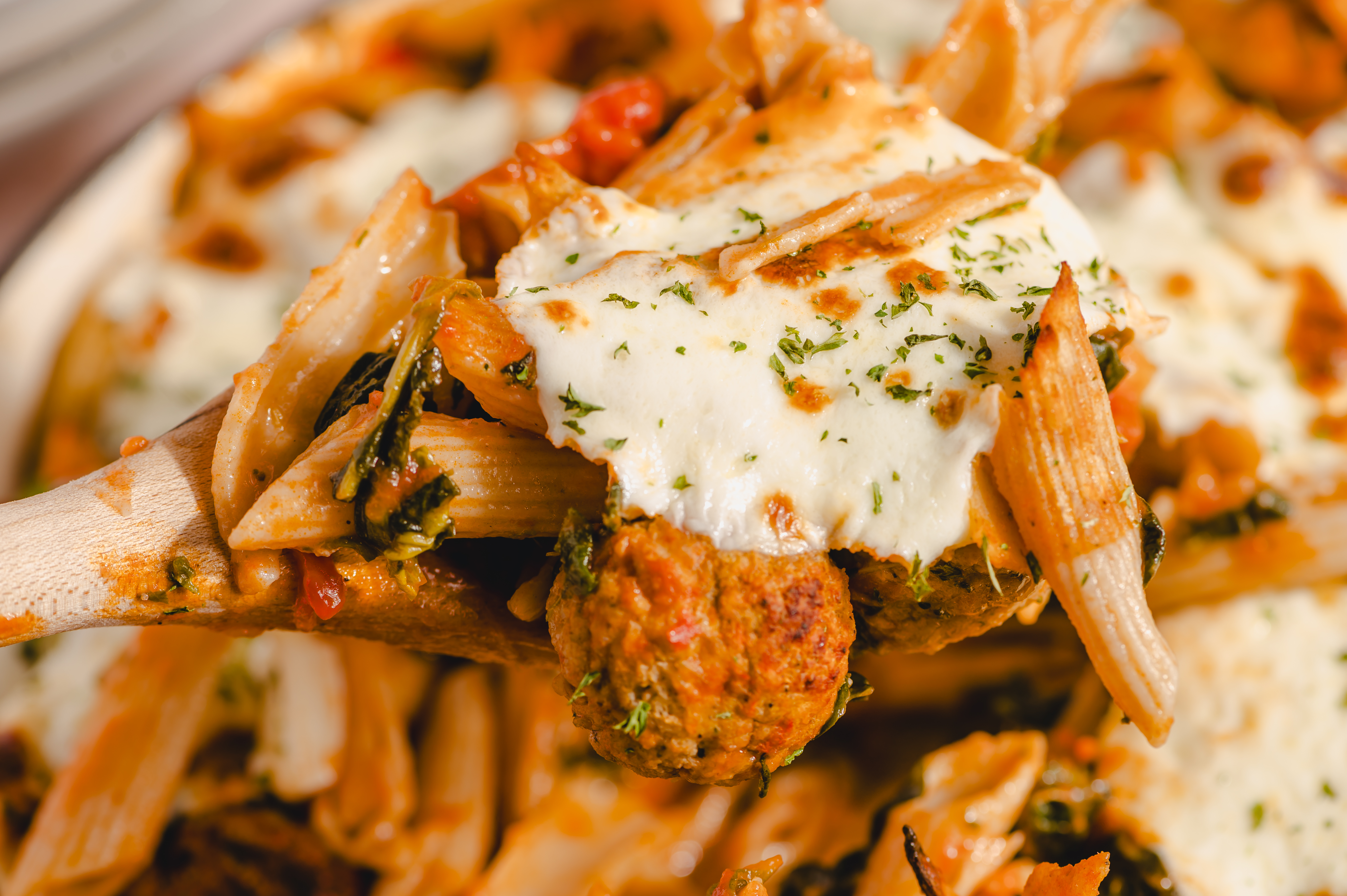 Mimi's Meatball Casserole is just a marvel of a Sunday dinner! Everyone is going to want to load up their plates with piles of nourishing and tender whole-wheat pasta and savory, juicy, homemade turkey meatballs, with a hint of parmesan sharpness. A blanket of lightly crisped and melty mozzarella just makes Mimi's Meatball Casserole all the cozier and more delicious! Sunday dinner has never felt this satisfying!