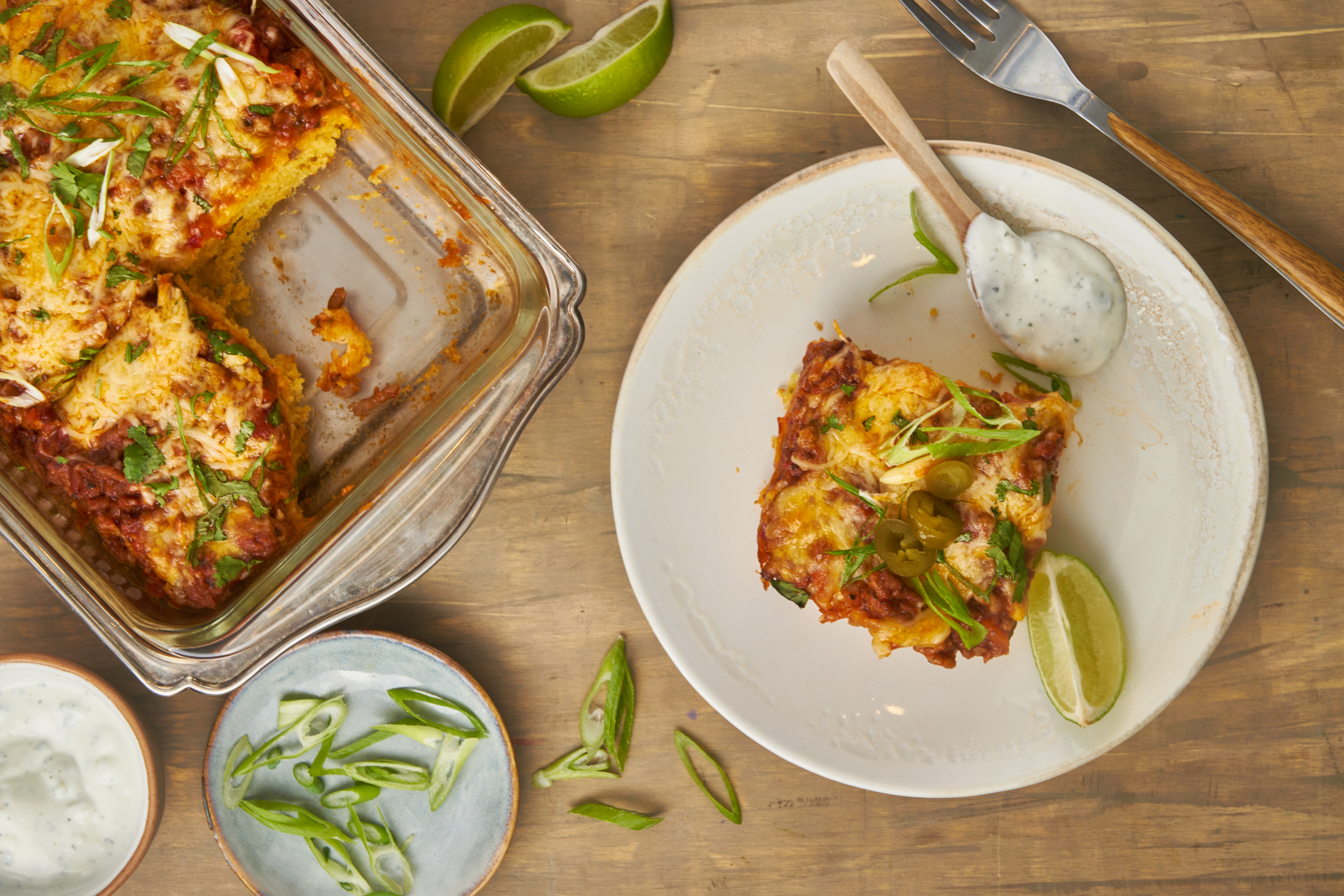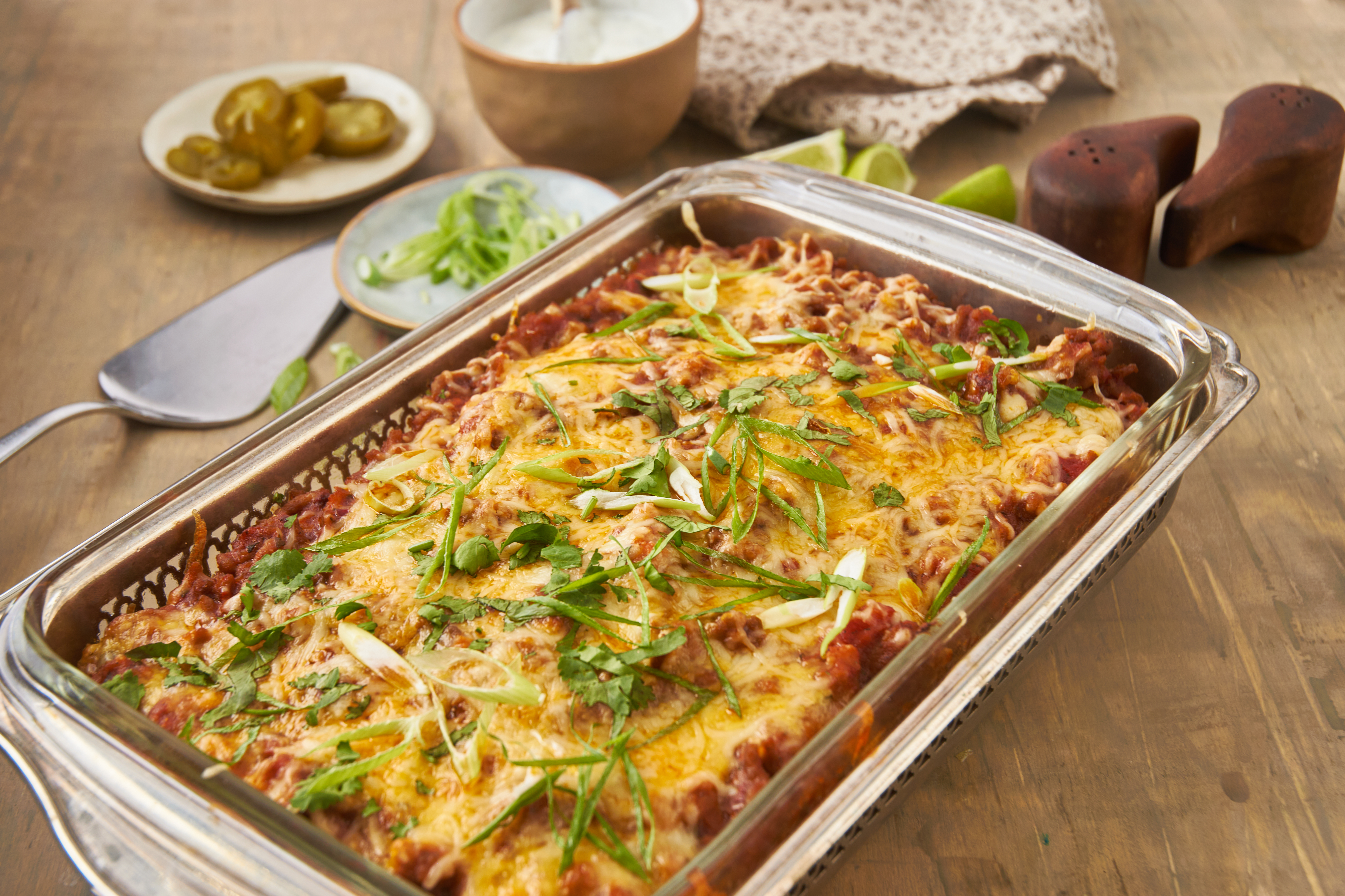 Step 12 -Serve the casserole topped with the jalapeños, the cilantro, the green onions, and the lime wedges.