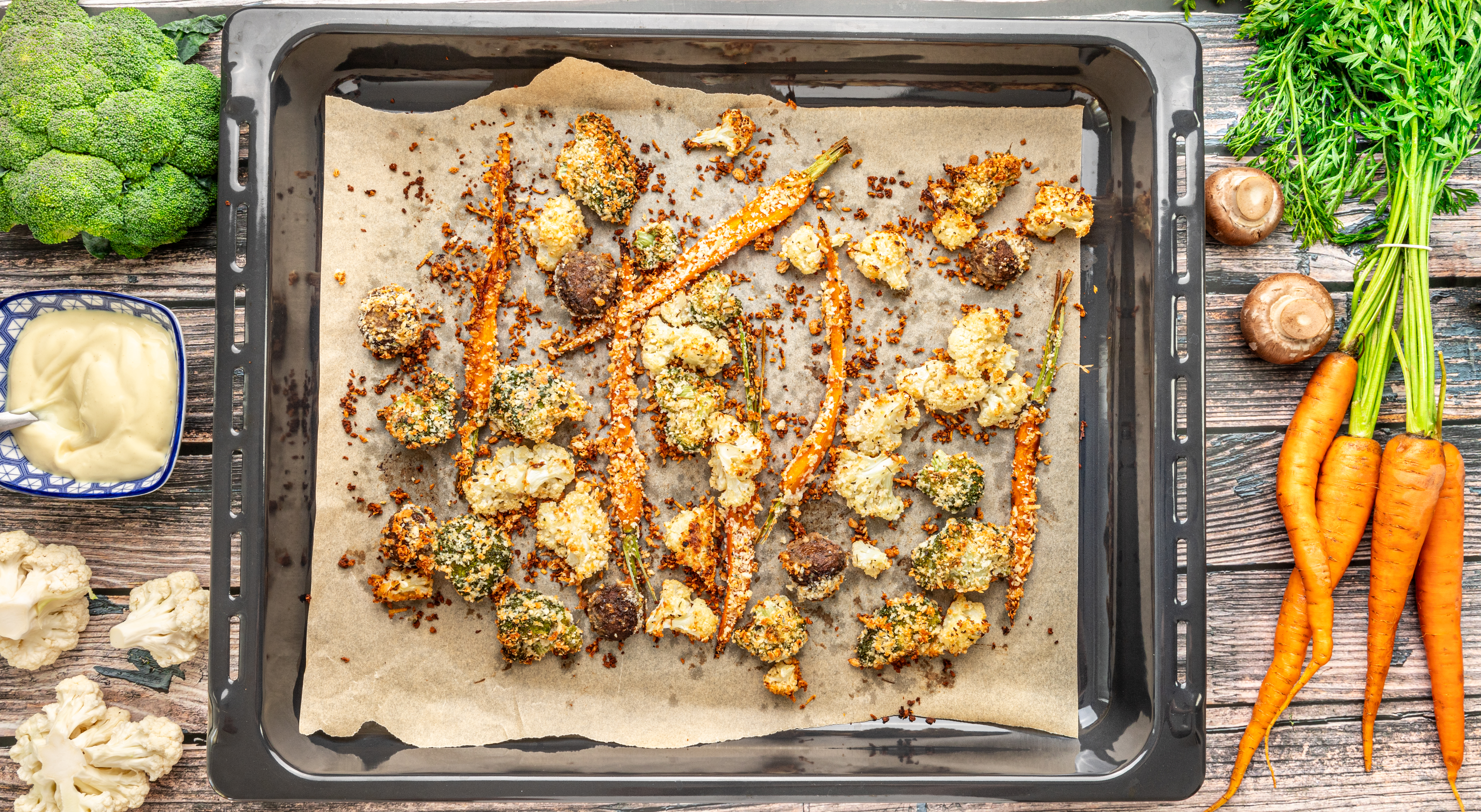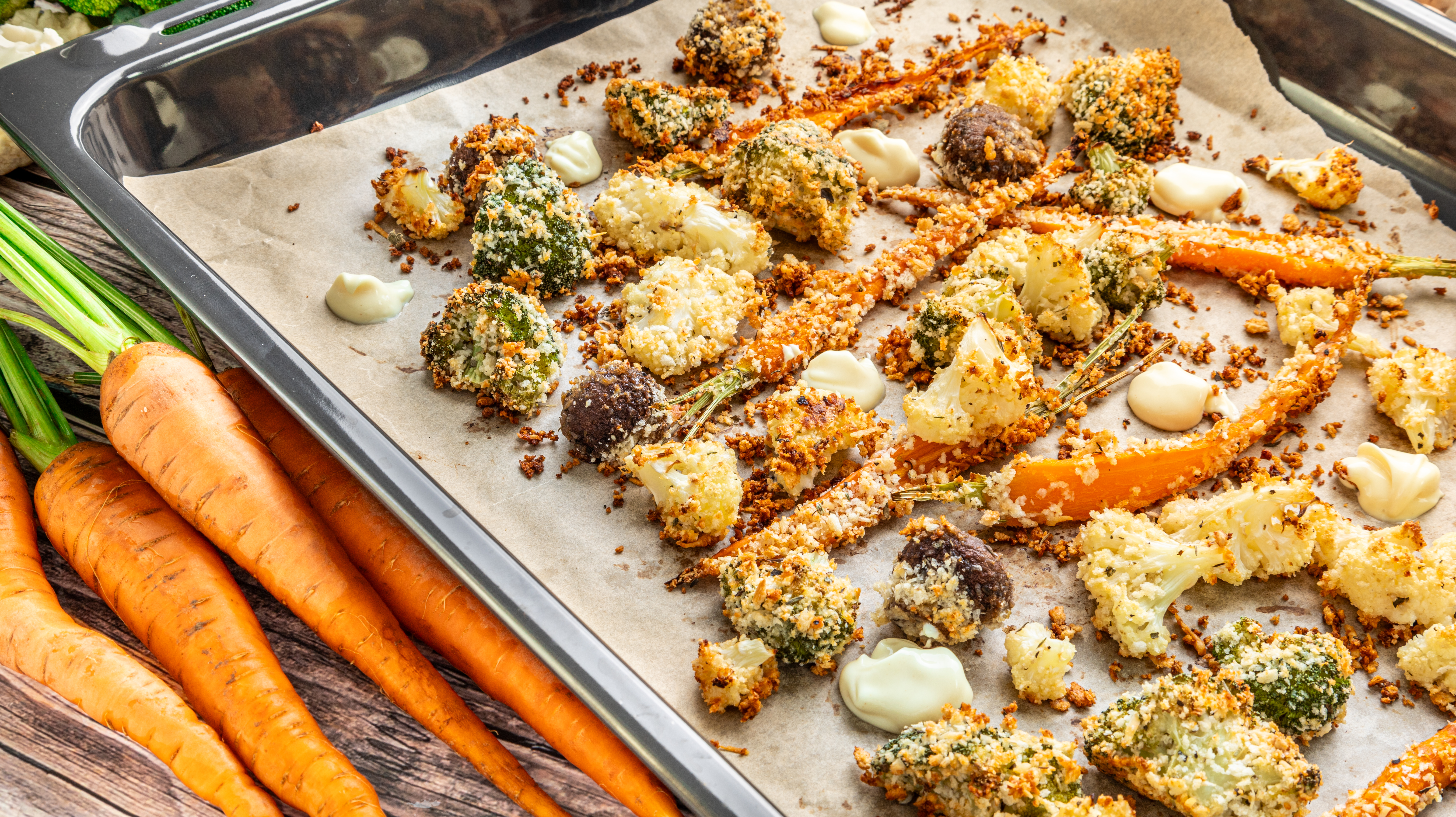 Mmmm, crunchy, cheesy, crispy! That sounds like a good time and a great way to eat your veggies! Oven-Fried Veggies makes a medley of garden-fresh vegetables into a carnival of fun as they are coated in breadcrumbs and parmesan, then drizzled with butter before baking to a tender inside and crisp outside! Plus, they are served with a creamy, tangy aioli for dipping! Who needs greasy fries when you could have these Oven-Fried Veggies instead?