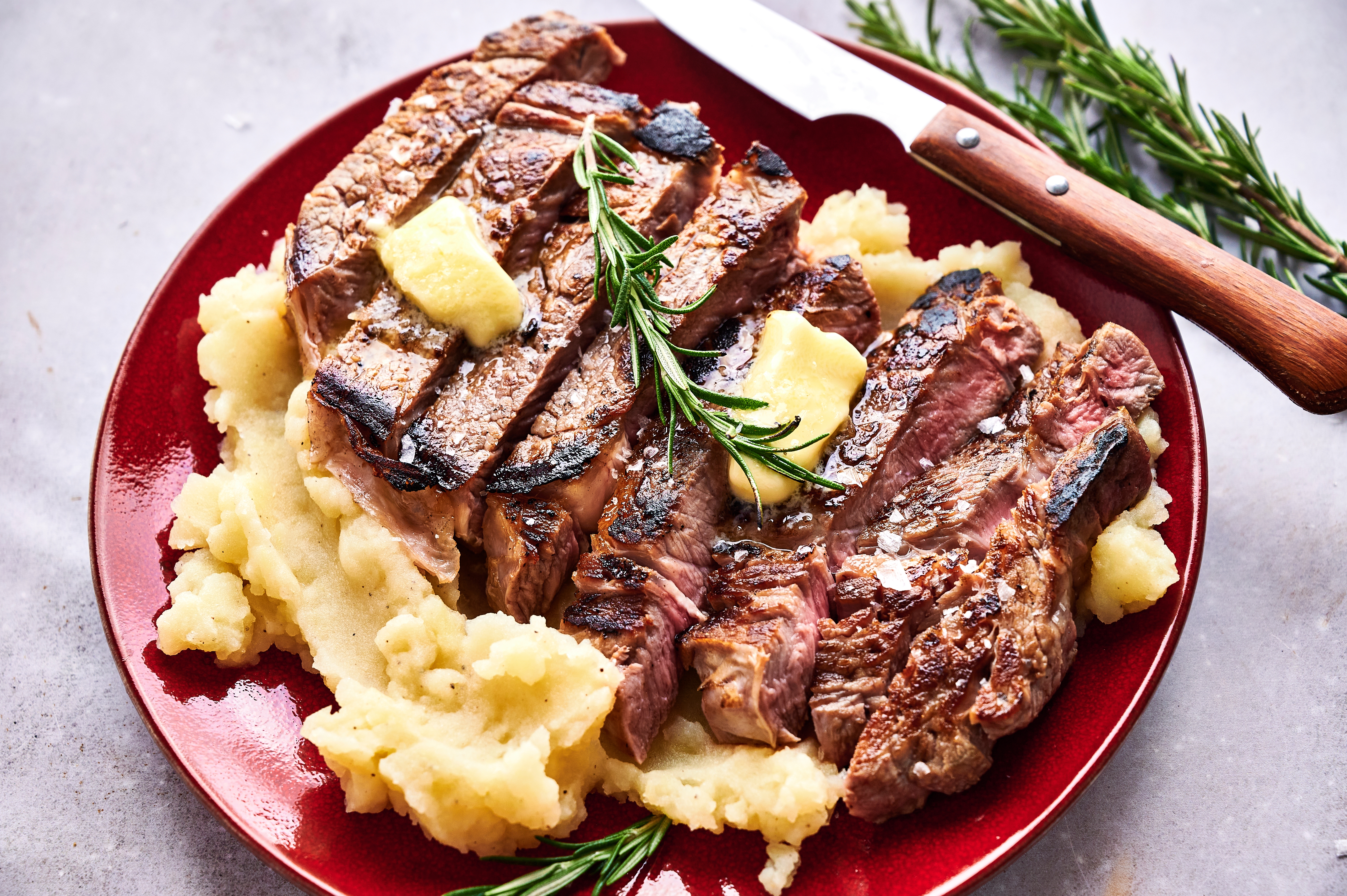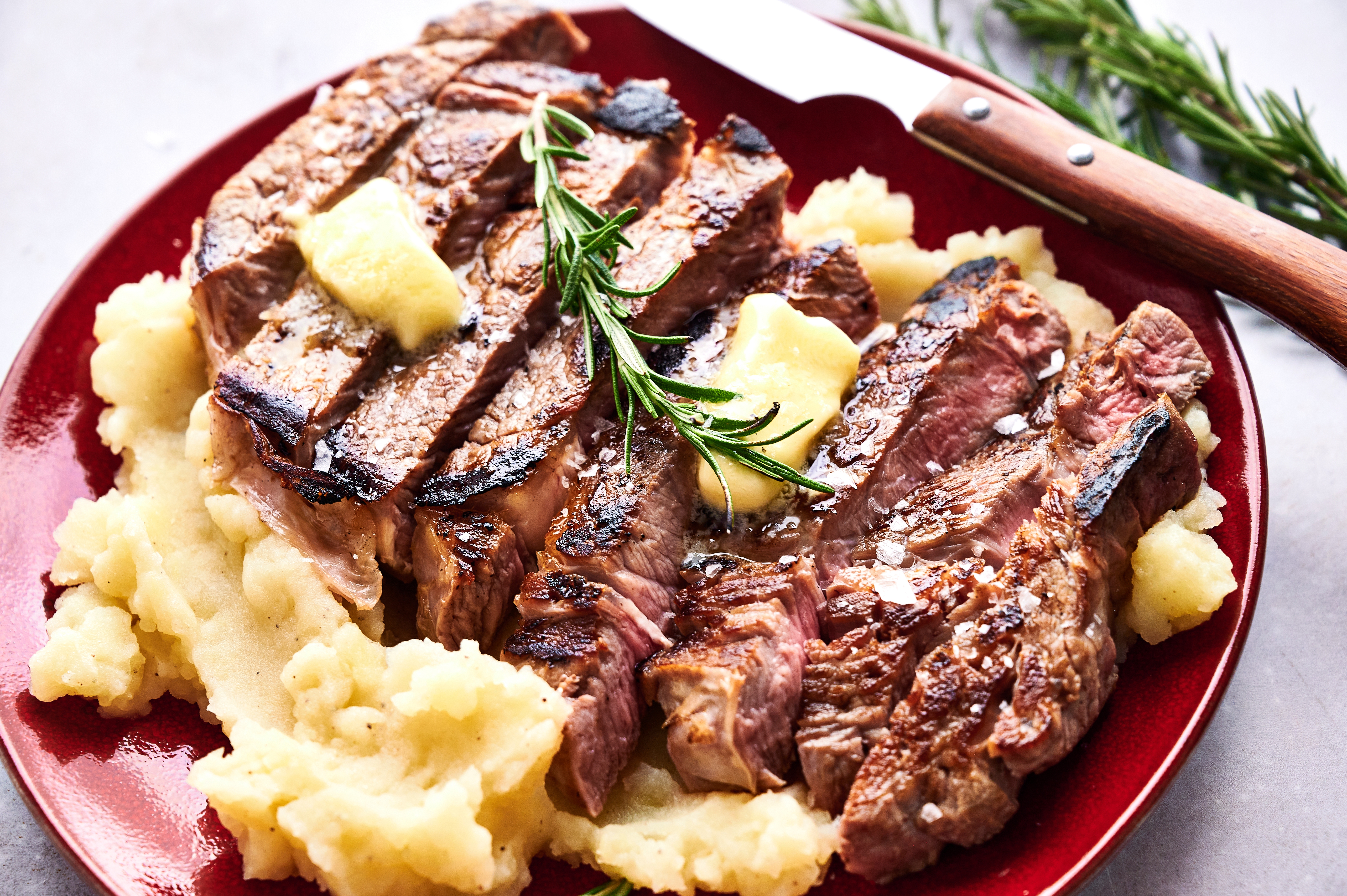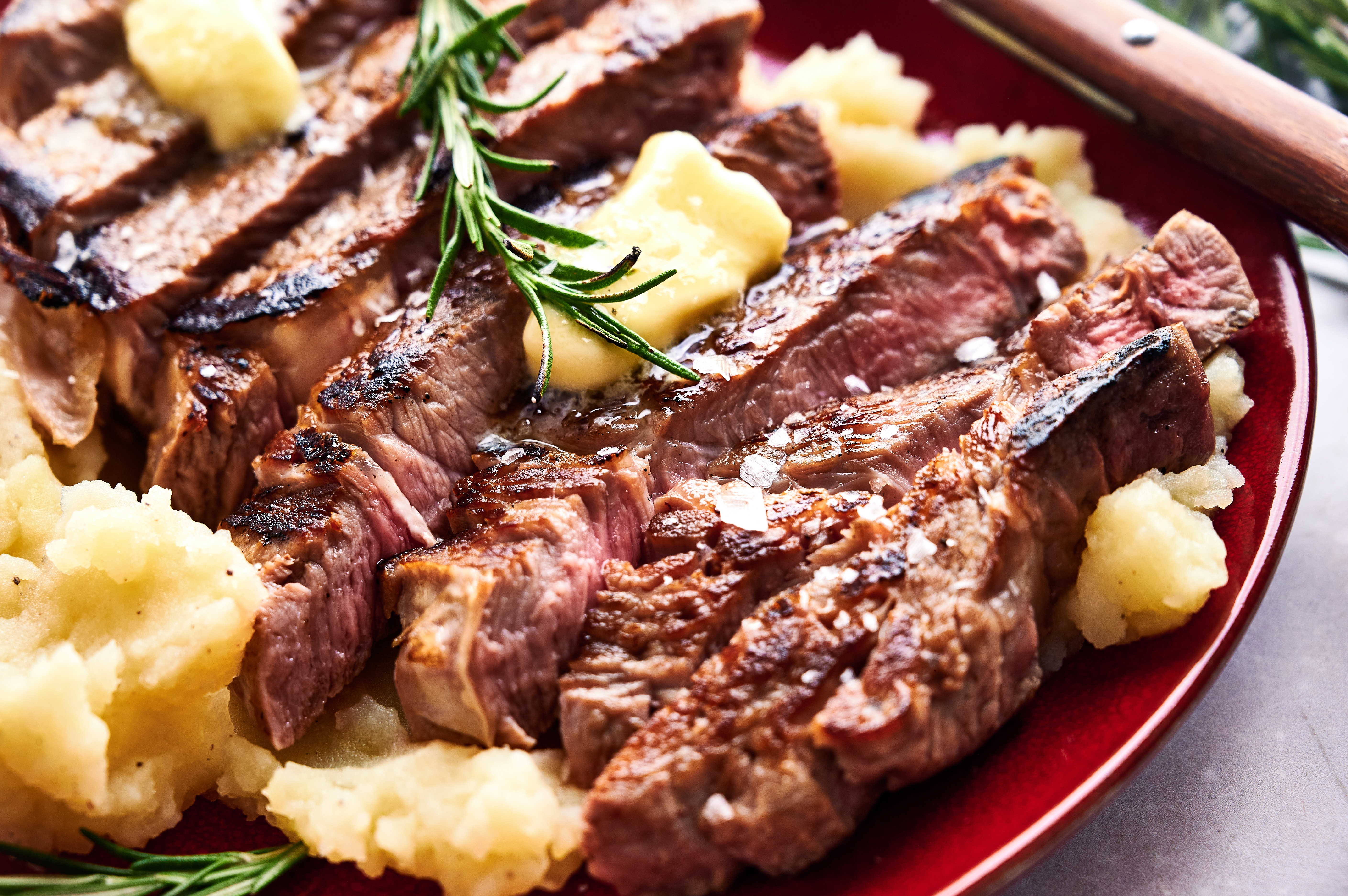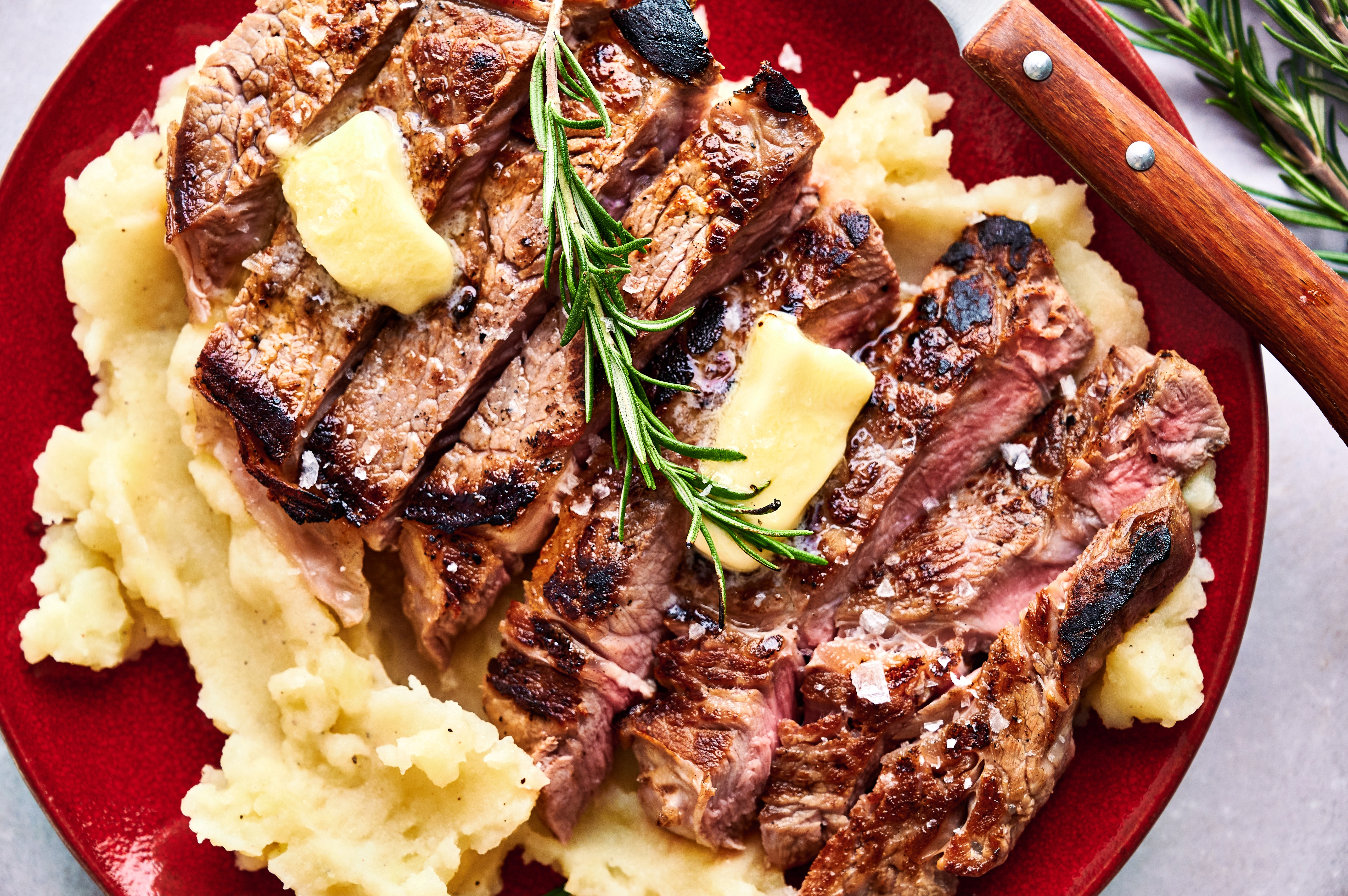 Nothing shows your love more than making a good meal. Let Pan-Seared Steaks be the chef-kissed dish for your next cozy gathering. Two juicy, thick steaks are lovingly seared and simmered in a rosemary-garlic-butter sauce. Served sliced and drizzled with more of that amazing butter sauce, this dish is pure perfection. Two is great company with these perfectly cooked Pan-Seared Steaks. Who needs a crowd (bigger than four, anyway)?