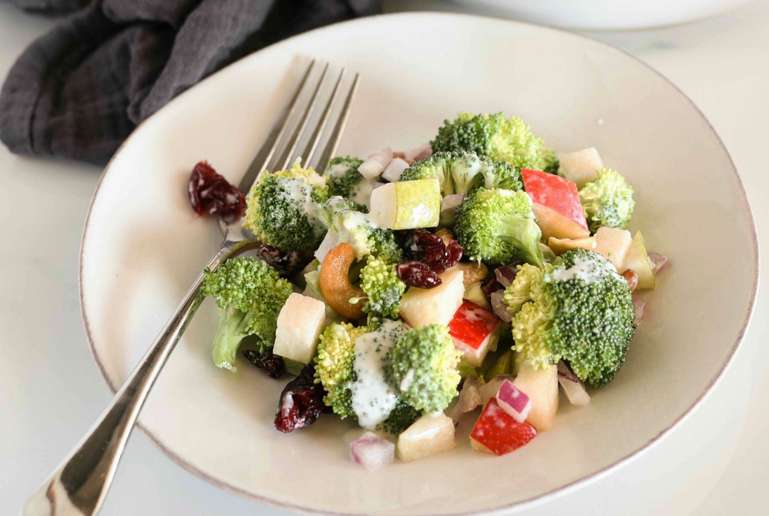 Step 1 -In a large bowl, combine the broccoli, the apple, the pear, the red onion, the cashews, and the cranberries.