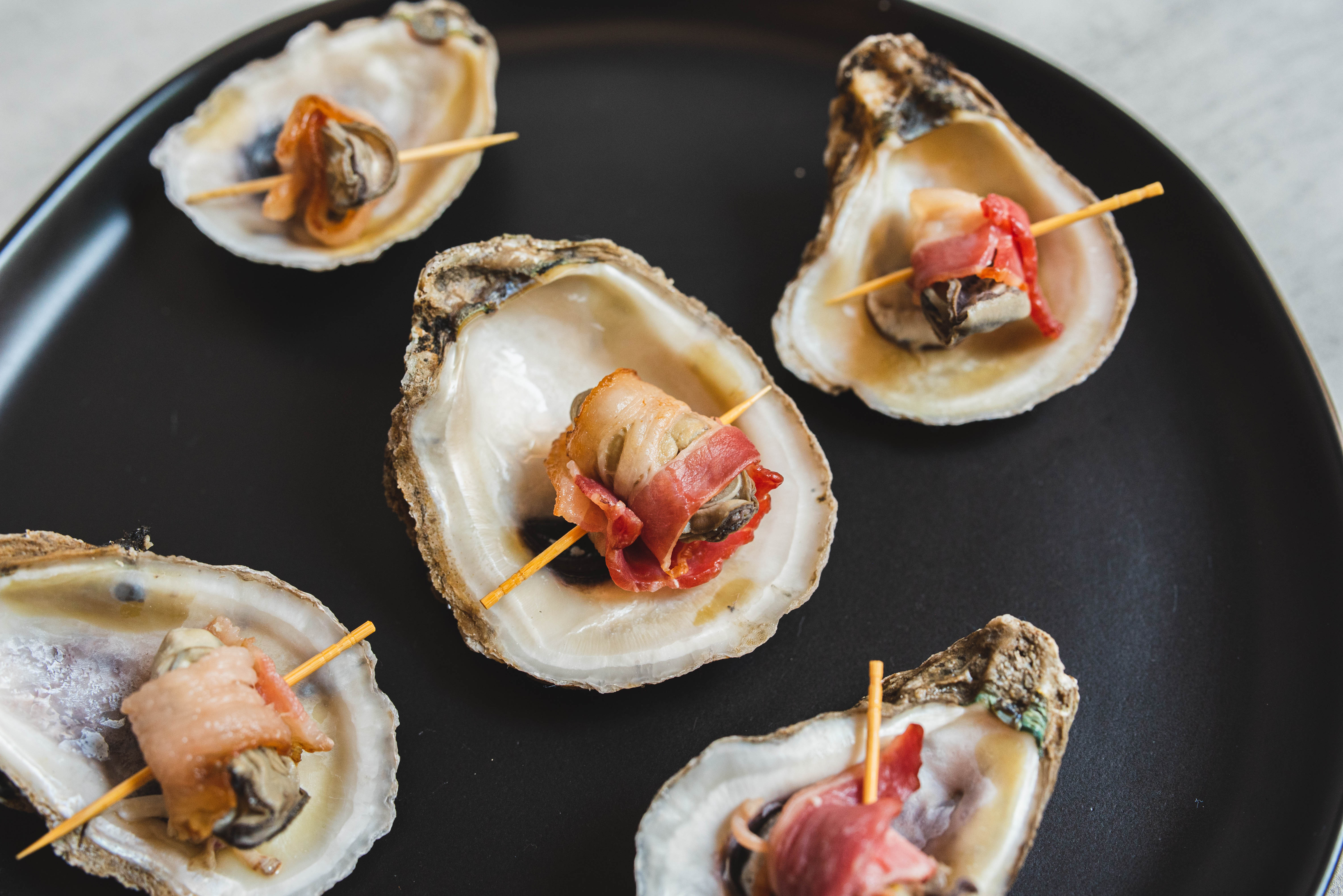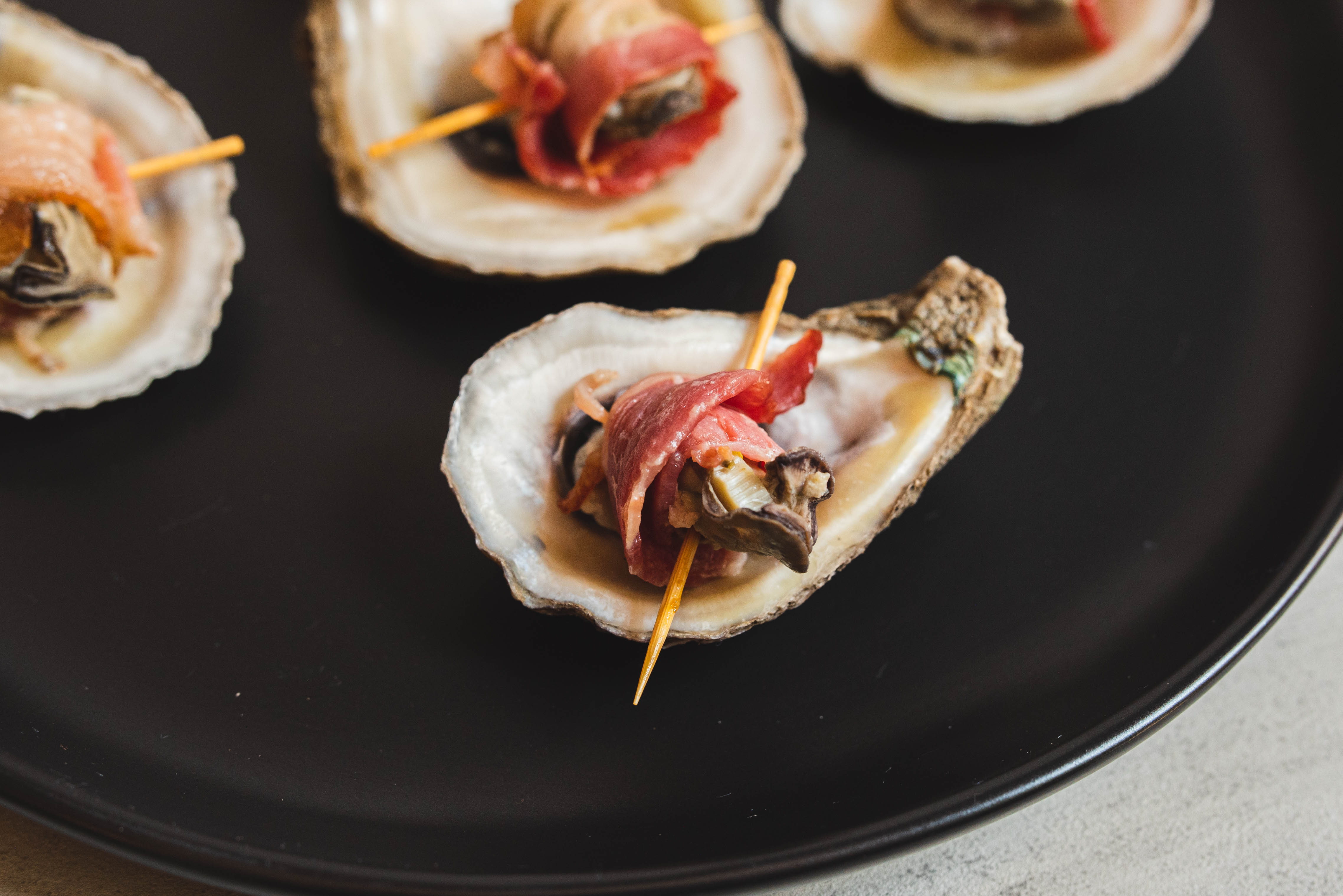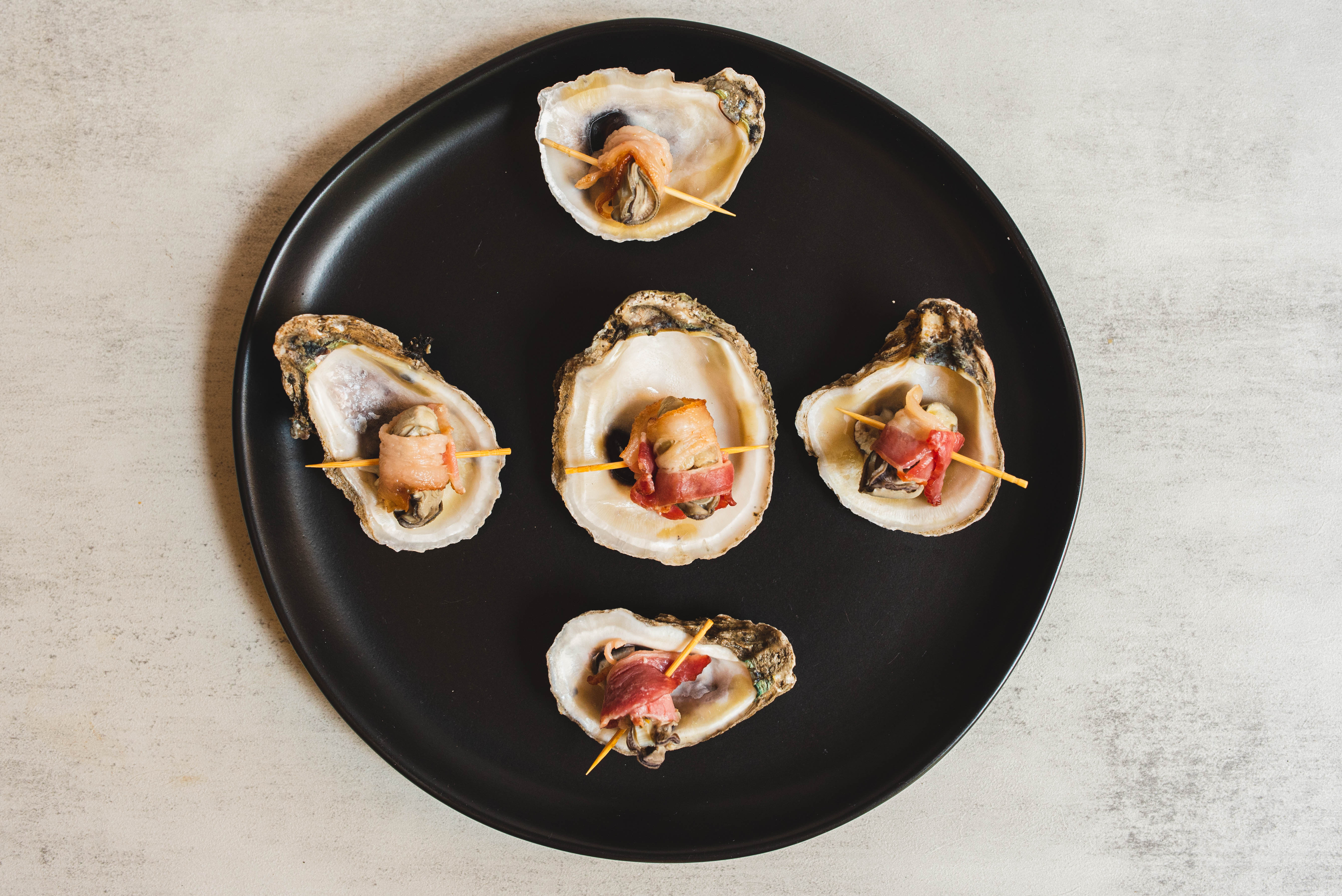 Step 4 -Wrap a bacon piece around each small oyster, securing with a toothpick. Overlap the edges of the bacon by about 1 inch, if possible.