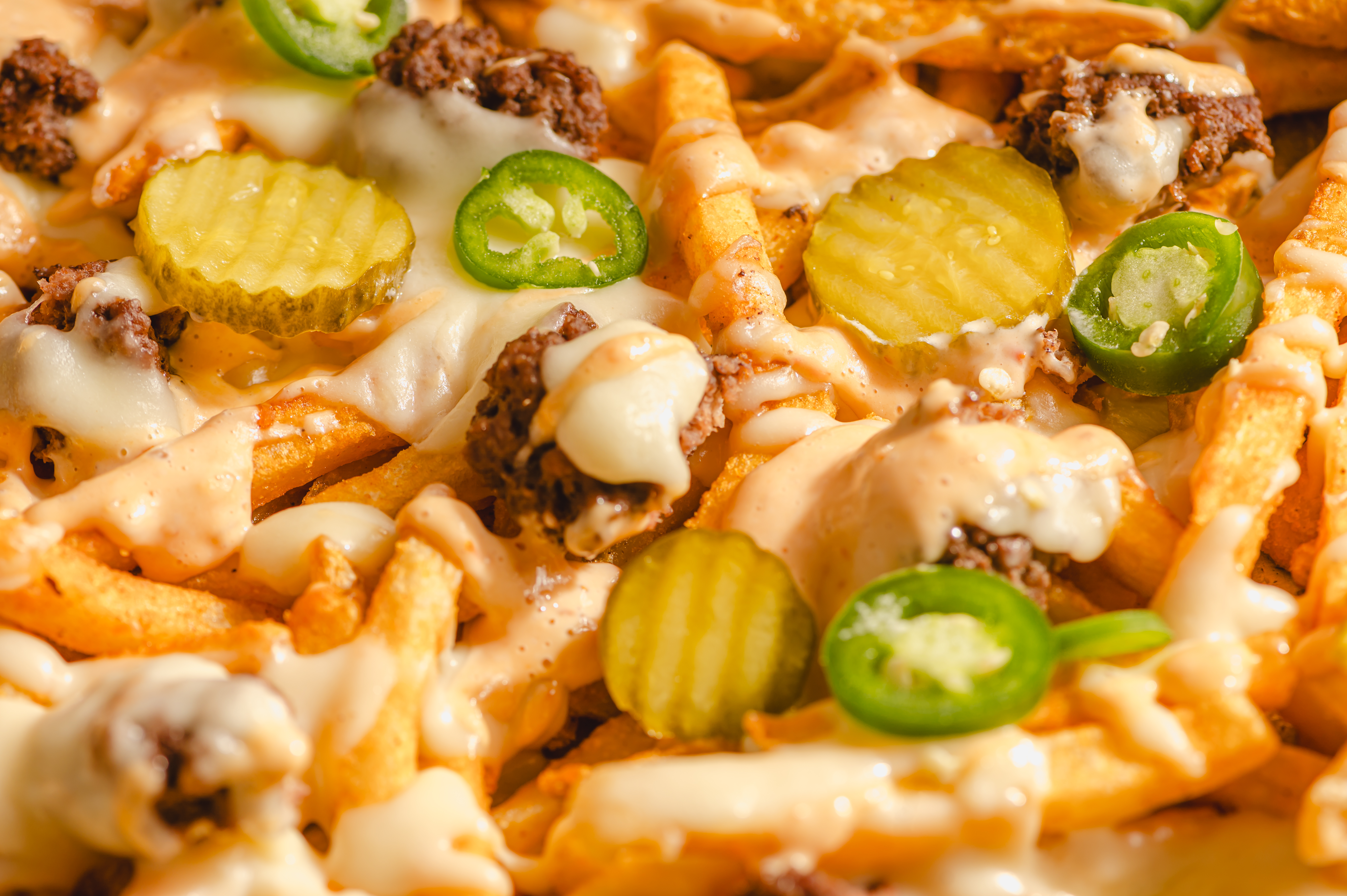Step 20 -Serve the burger-fries topped with the Thousand Island dressing, the pickles, and the jalapeños.