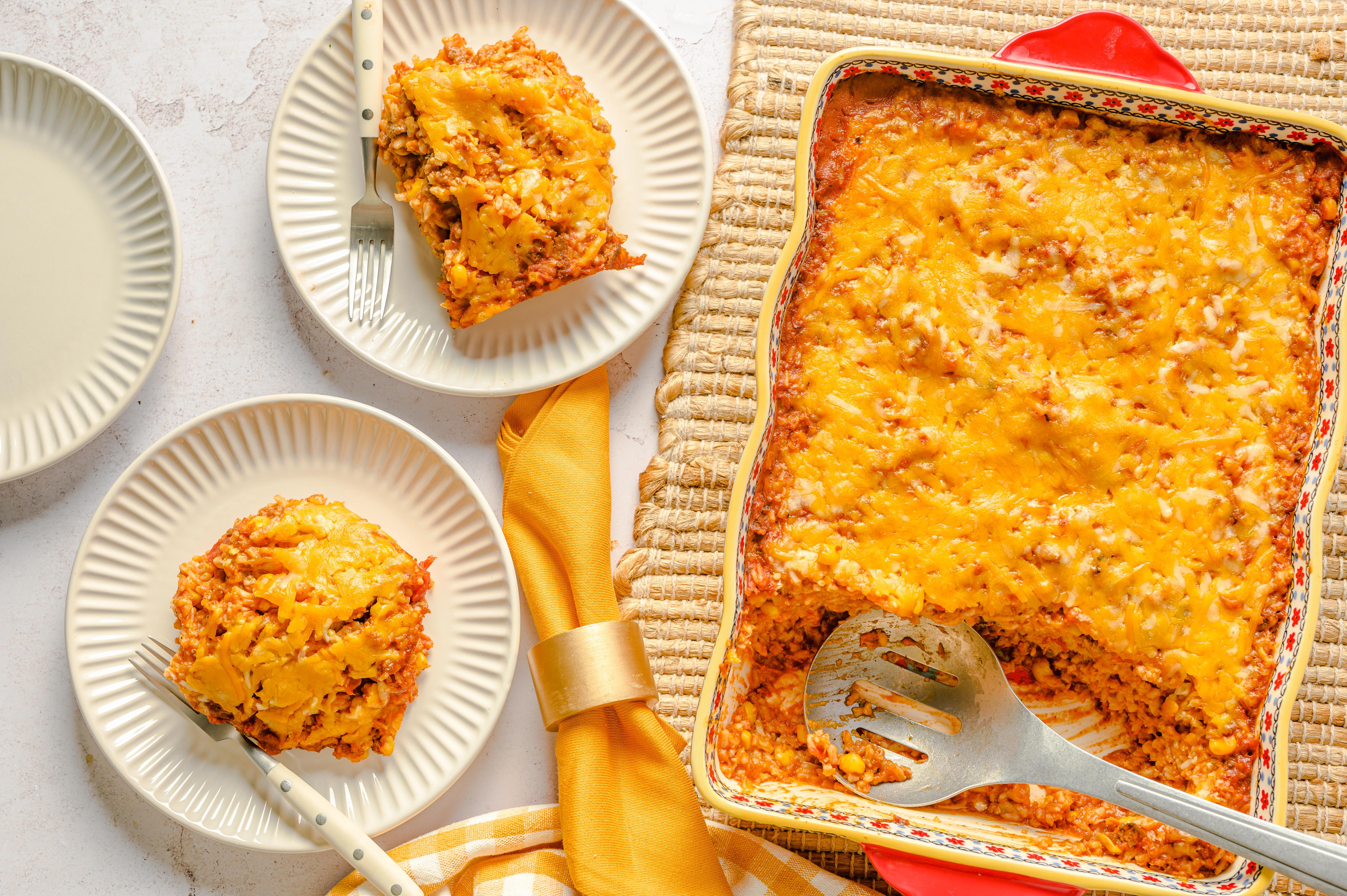 When your tastebuds need a vacation somewhere south of the border, but you are cooking for a whole crew, make things just a little easier for yourself. This Southwest Enchilada Bake is jam-packed with all the Mexican-cuisine flare you and your taste-traveling entourage love! No toasted tortillas needed here, this rice is living its best tender, tasty life surrounded by ground beef that's sipping on a tangy enchilada-sauced margarita that's garnished with juicy diced tomatoes, always-loved refried beans, and a sweet corn twist. To really top off this vacay for your mouth, it sticks its toes in the sand with an umbrella of gooey melted Colby-Jack cheese. Take flight and pack your cares away today with the jet-setting Southwest Enchilada Bake.