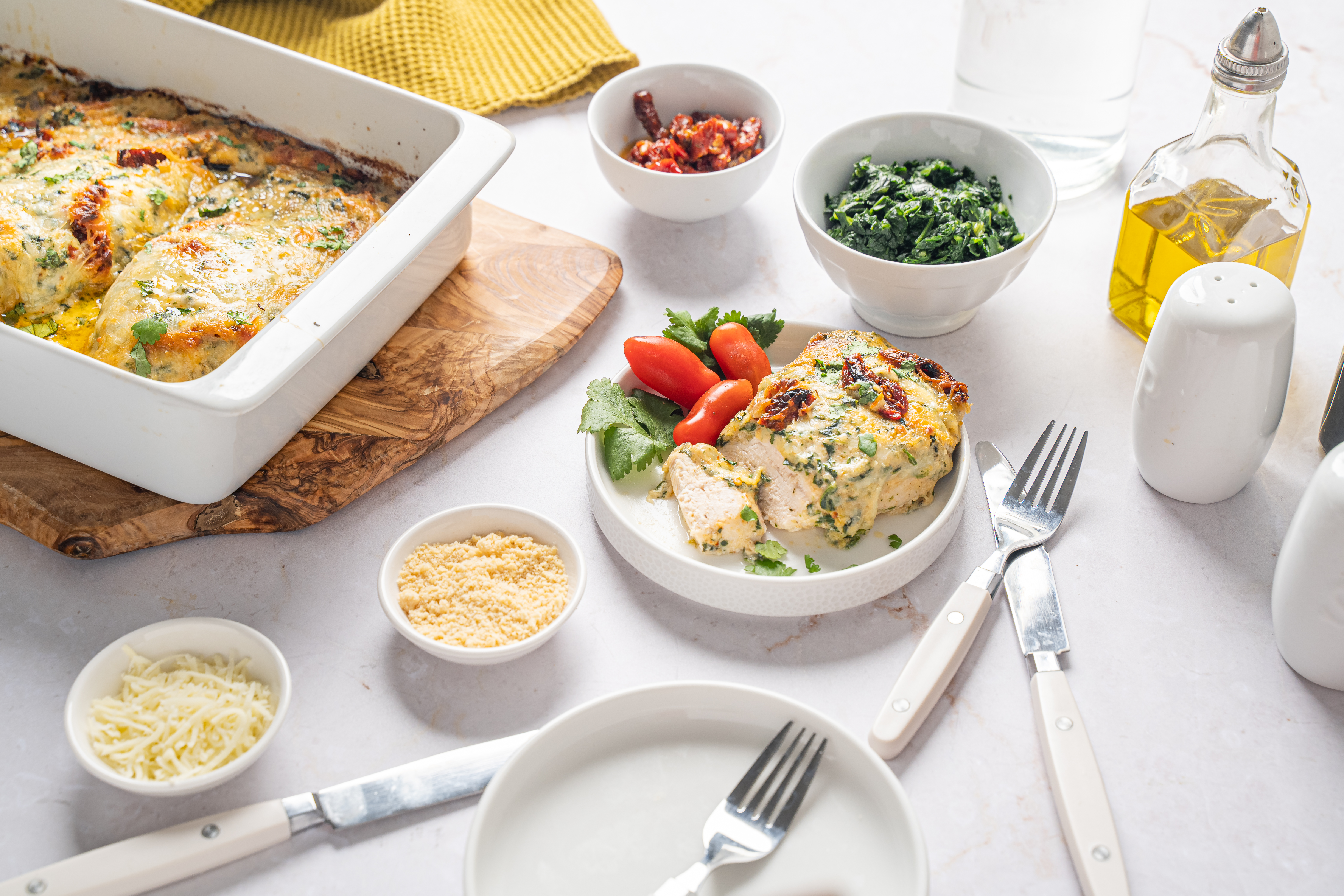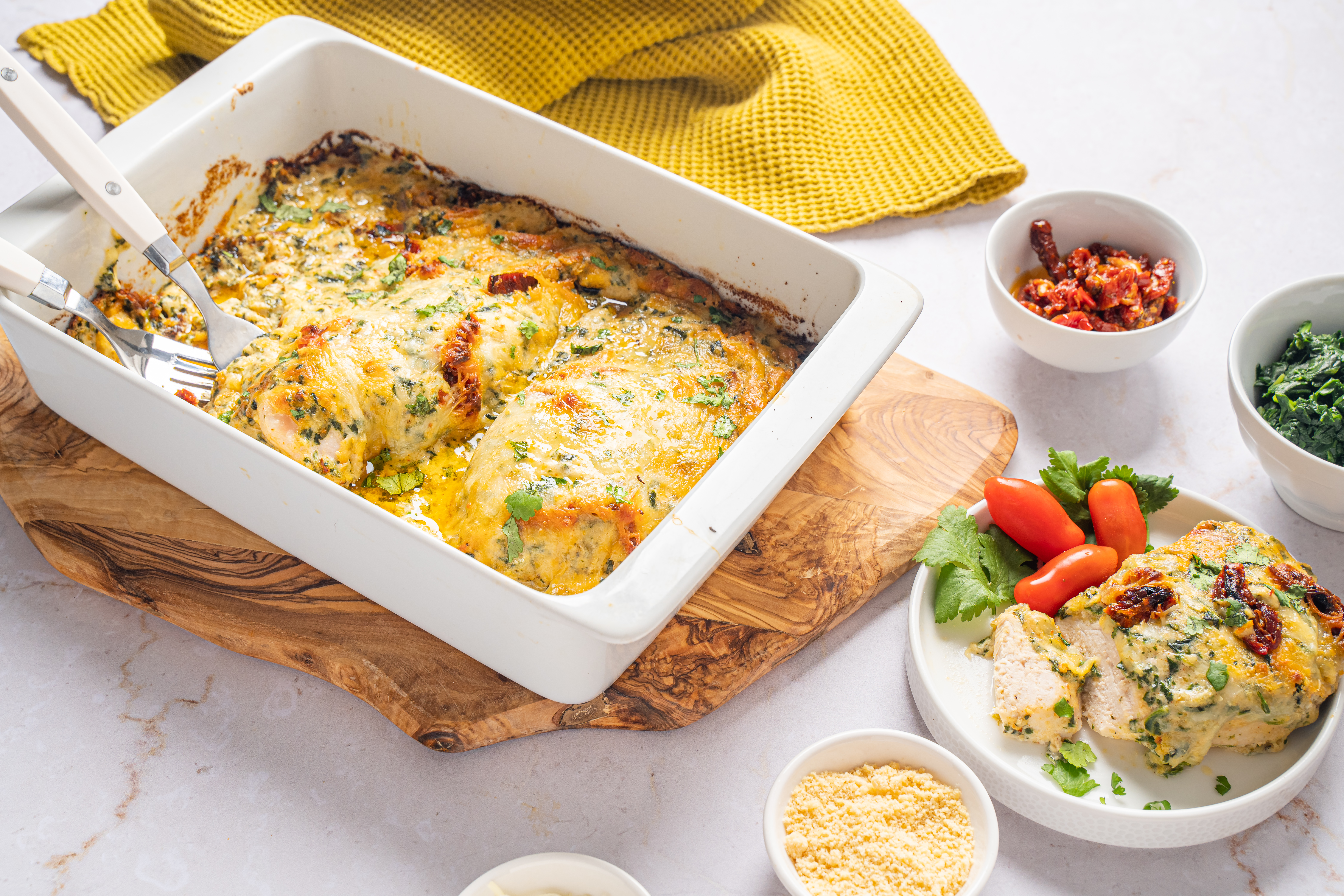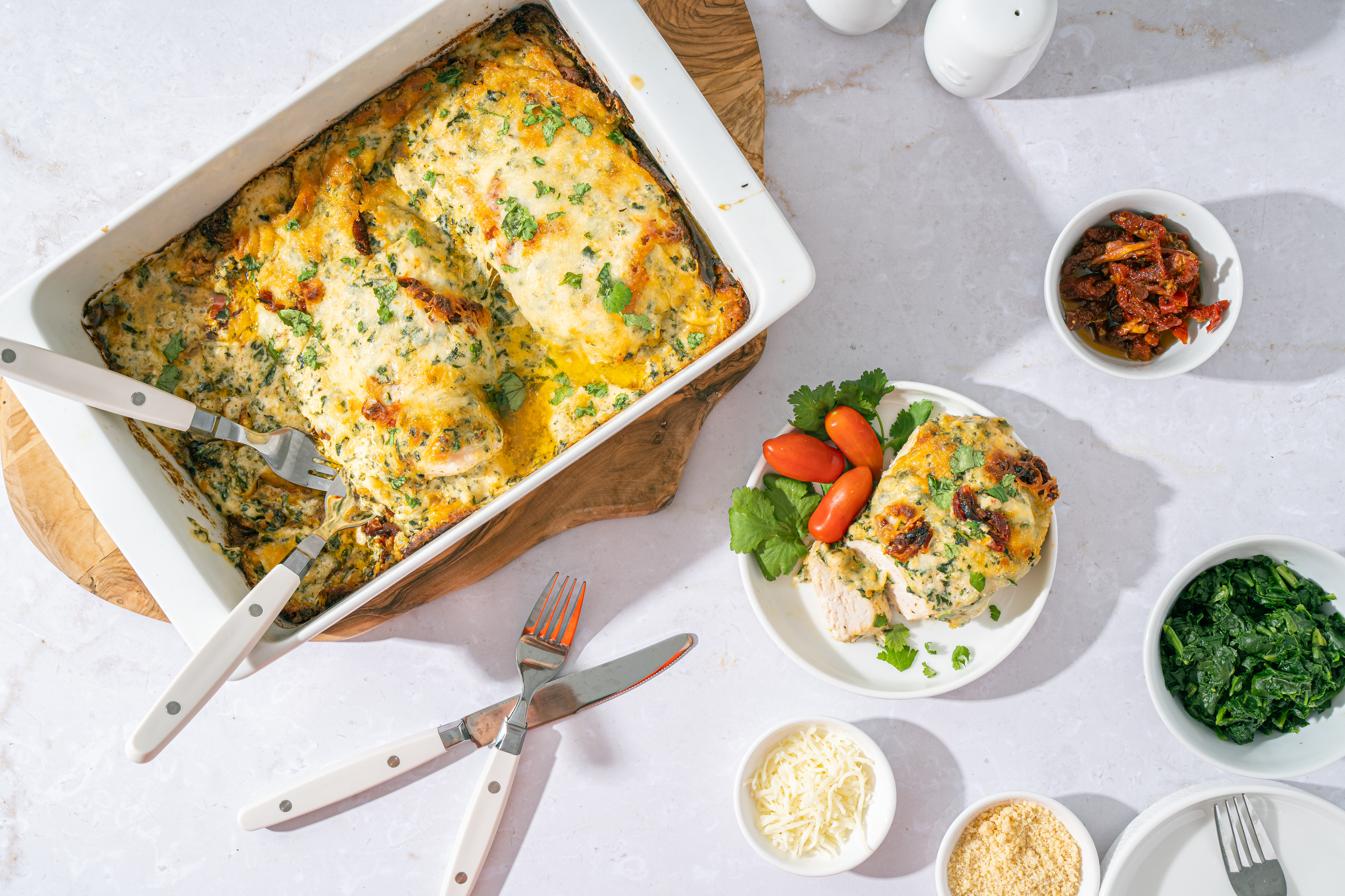 Take your chicken for a little drive through the undulating hillsides of the Tuscan countryside with this delicious and easy casserole. The perfect travel buddy for any of your stay-at-home mealtime excursions, this Tuscan Chicken Casserole won't stay in its lane when it comes to flavor. The oven maneuvers its way around the chicken to ensure its left super tender, allowing this well-traveled bird to take the driver's seat and slowly meander alongside the highway of creamy sun-dried tomato sauce and melted mozzarella, making this an unforgettable voyage. Take a quaint culinary trip with Tuscan Chicken Casserole for your next table-wide gallivant. Sometimes taking a meal through the awakening backroads turns out to be a memorable excursion for both you and your taste buds!