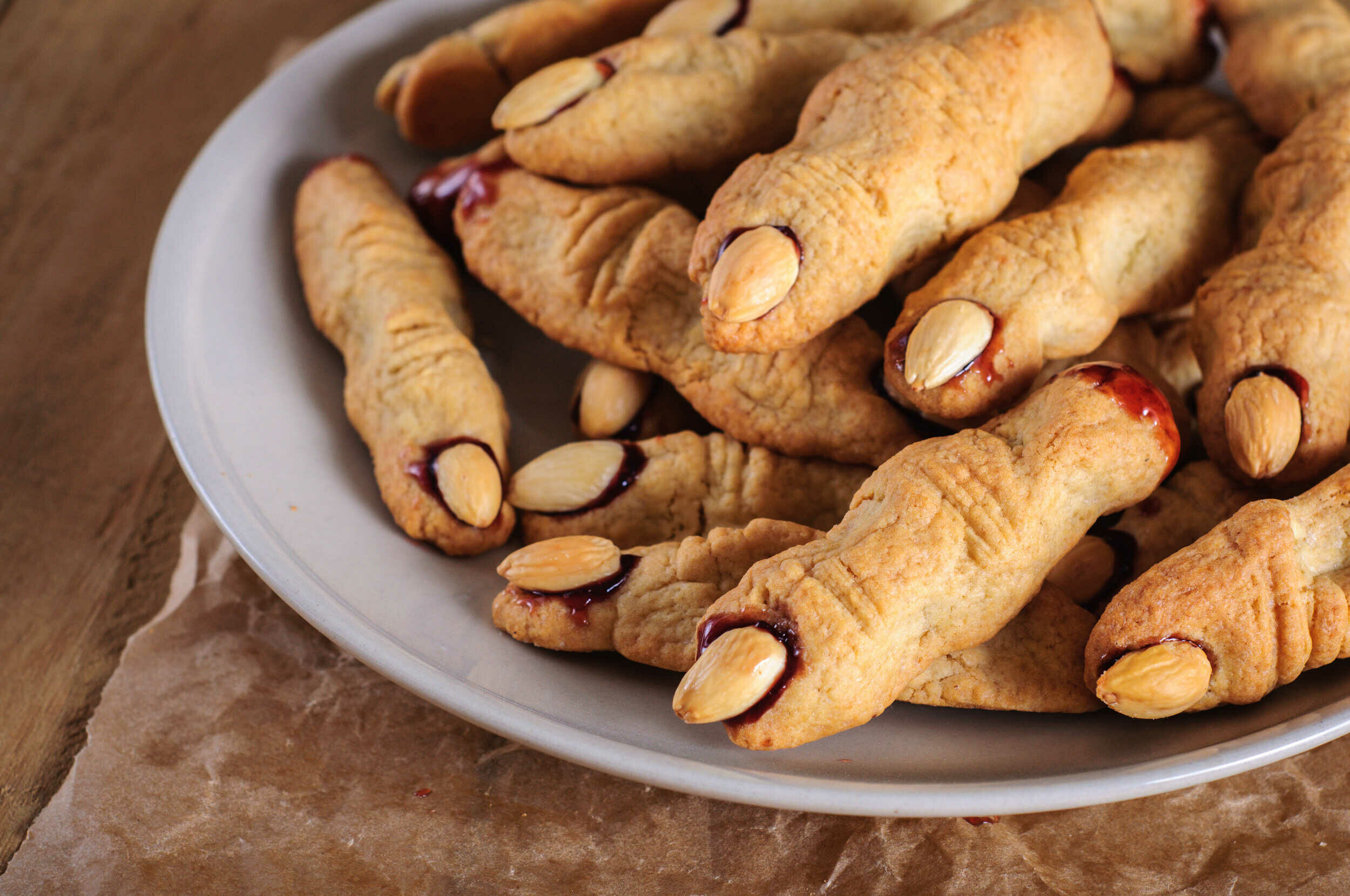 Witch Fingers will have you cackling with delight! These buttery cookies are brimming with sweet almond and vanilla flavors, with a crunchy almond "fingernail" for added texture. A dollop of strawberry jam elevates the whole confection with fruity notes and that elusive Halloween feel. Witch Fingers are perfect for an afternoon snack or a party tray with friends. They say Halloween is the season of the witch, but these cookies will have you saying it's the season of the baked good.